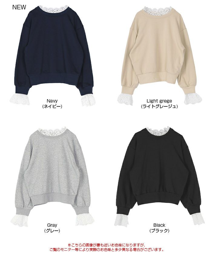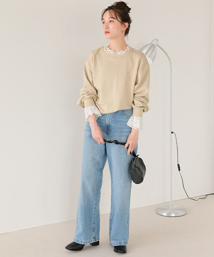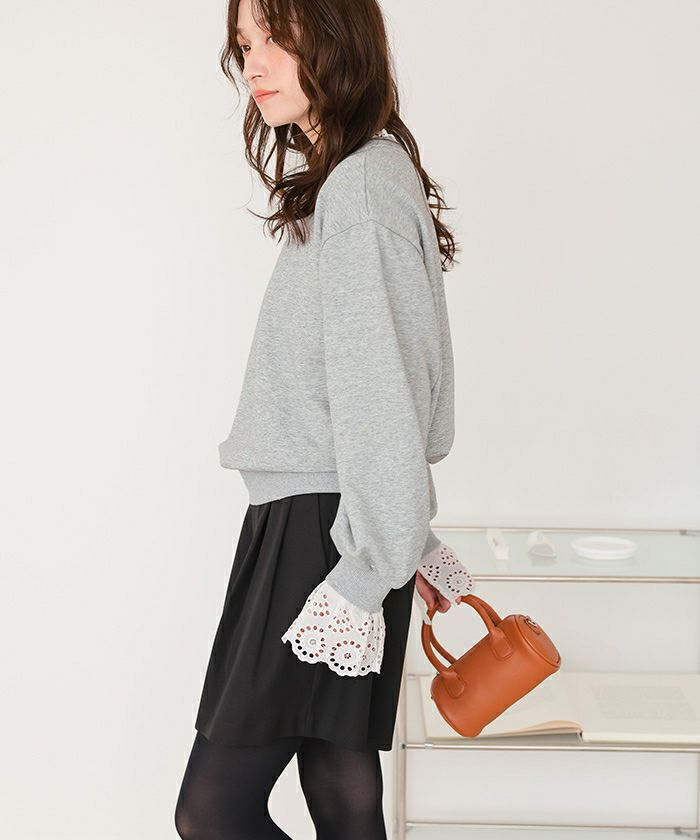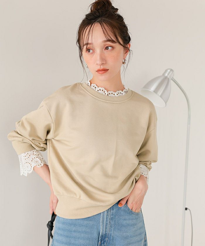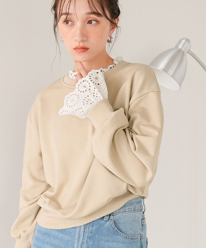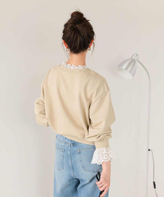 ・襟ぐりと袖口に施されたコットンレースデザインがアクセントになるスウェット。