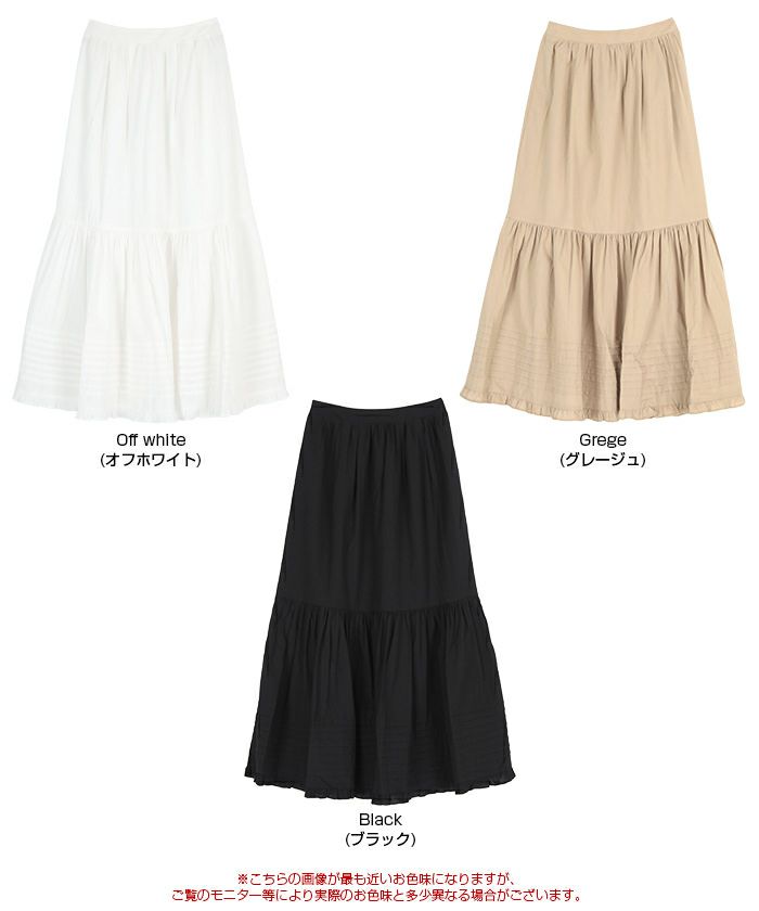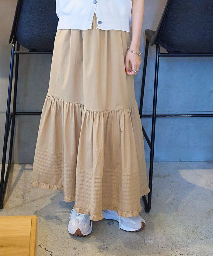 ・裾のフリルとティアードデザインが大人かわいいロングスカート。