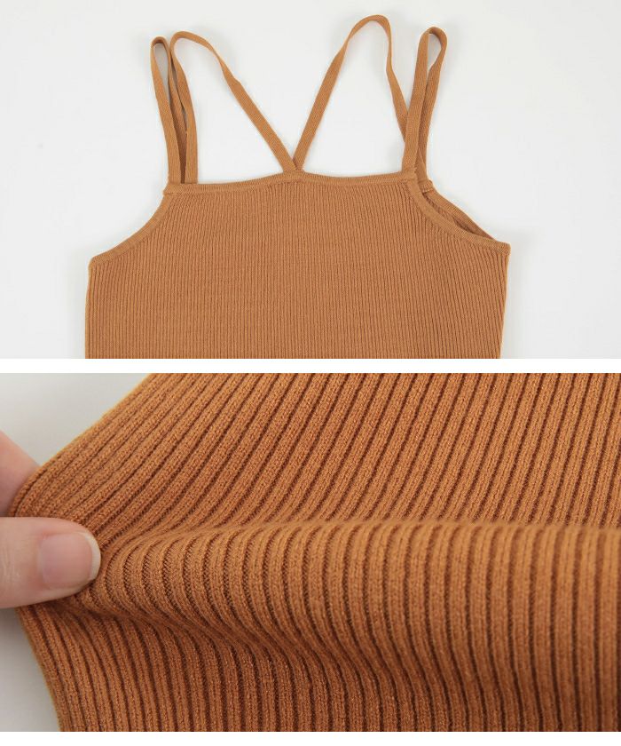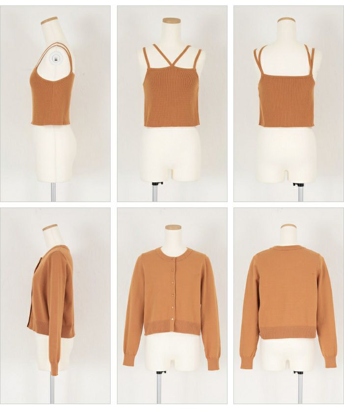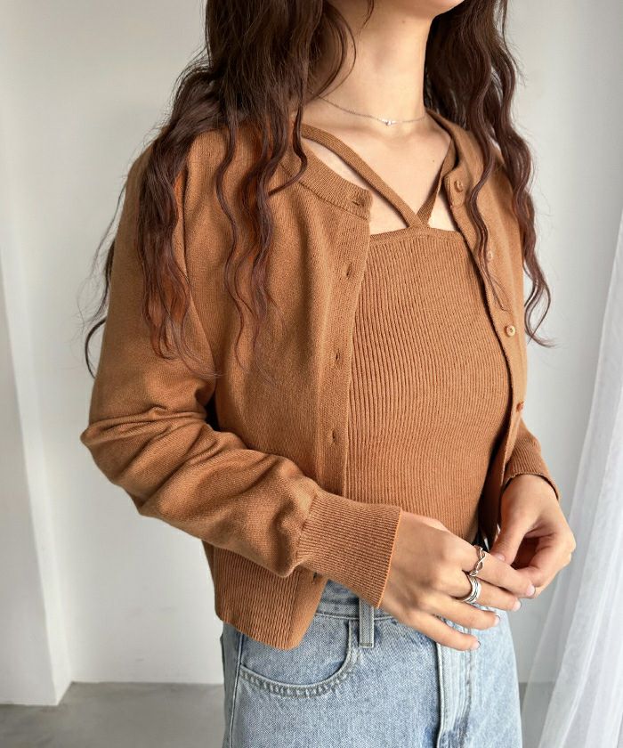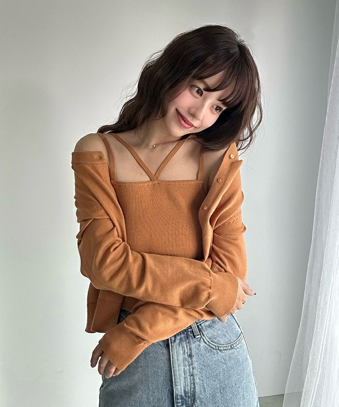 ・デザイン性のあるキャミトップスとカーディガンのアンサンブル。
