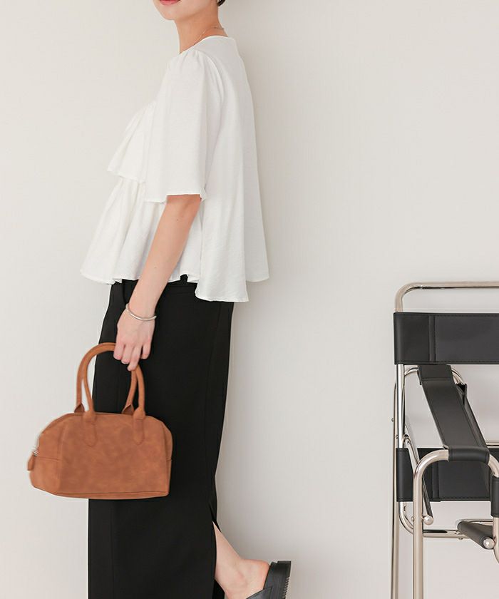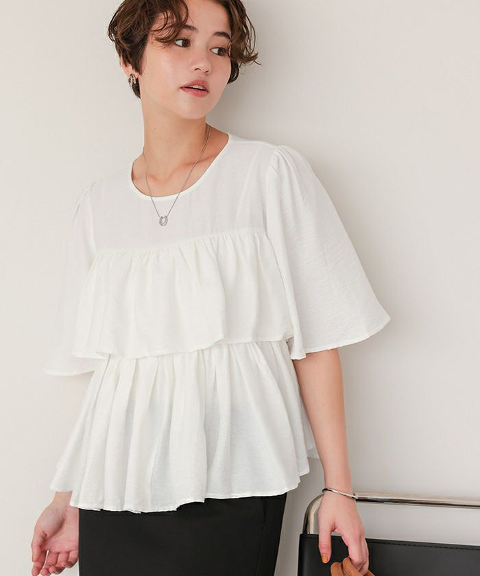 ・フロントフリルと程よくフレア感のある袖デザインで体型カバー。