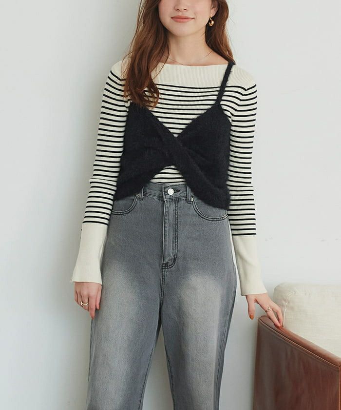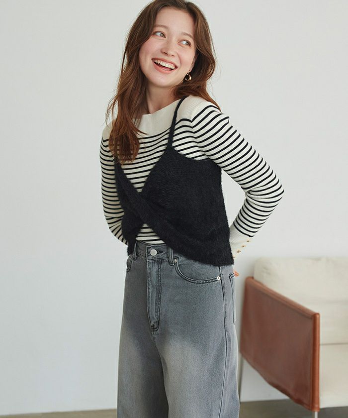 同色のニットと一緒に購入しました。 肩ストラップがサイズ調整できるのがありがたいです^ ^ ロンTや薄手のニットに合わせれるので着回しできるし可愛い!