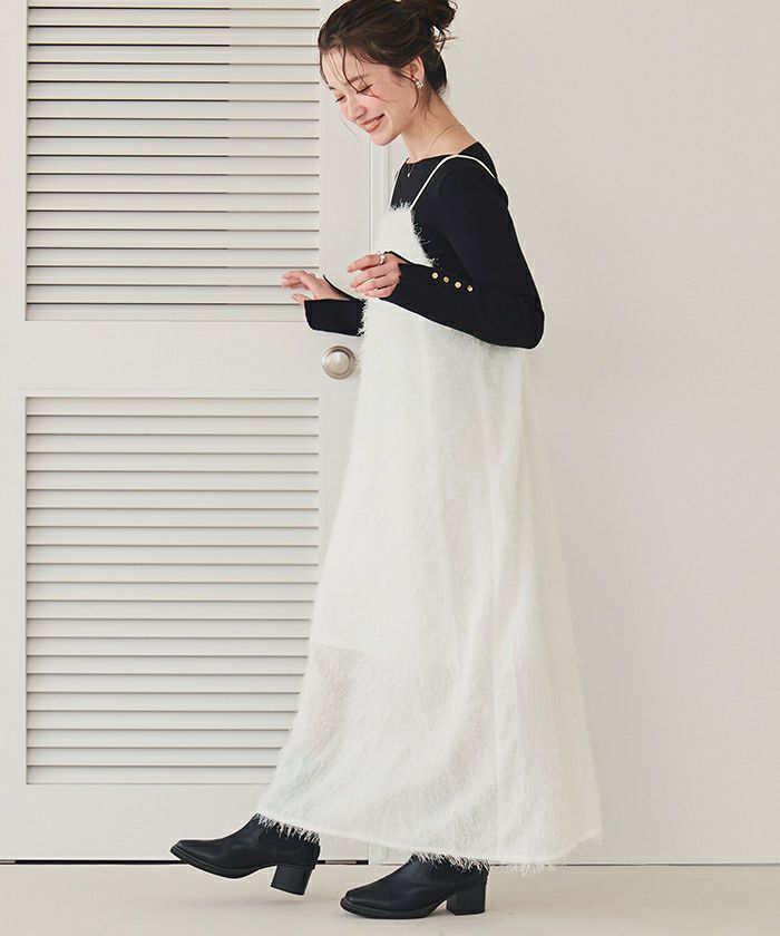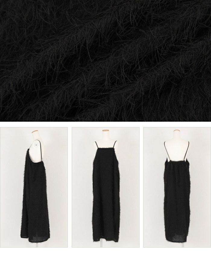 ・フリンジの毛足が長く柔らかい生地のキャミソールワンピース。