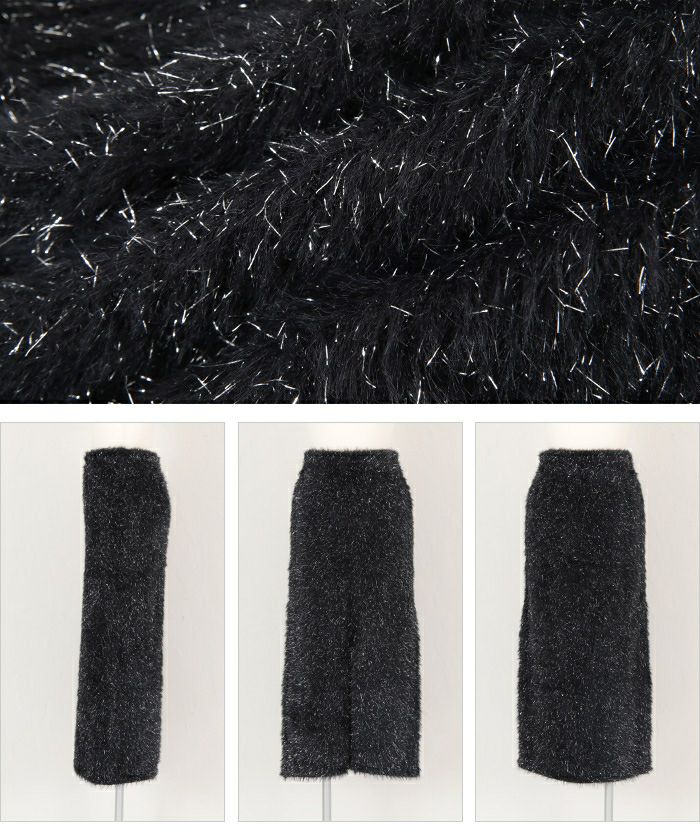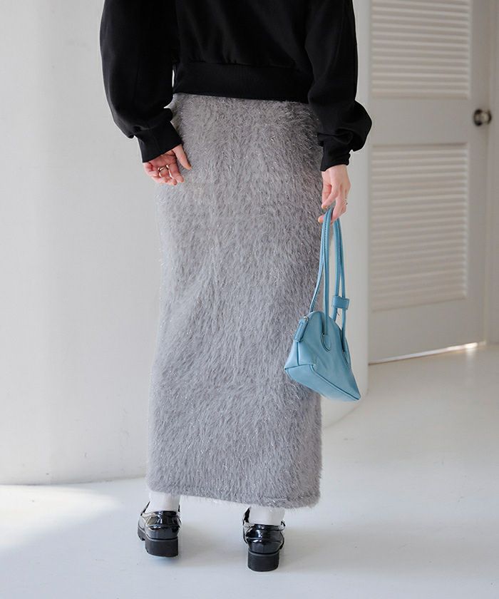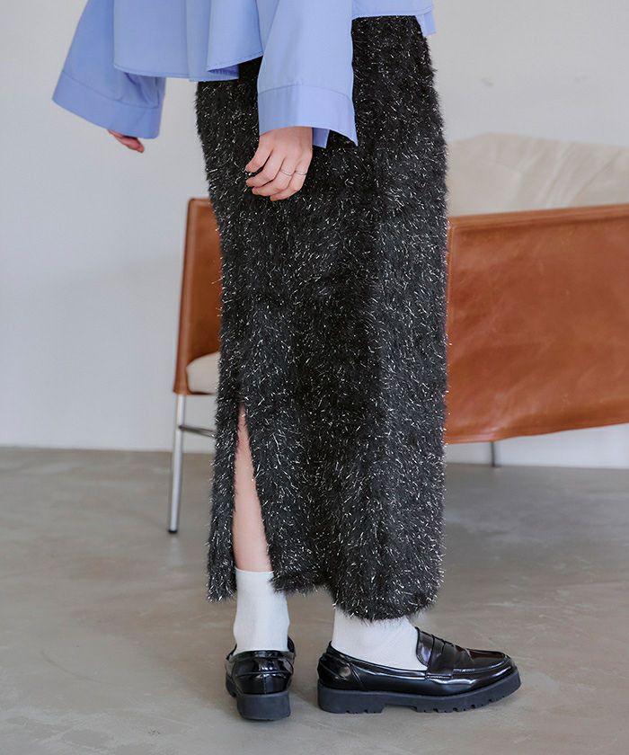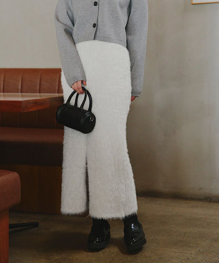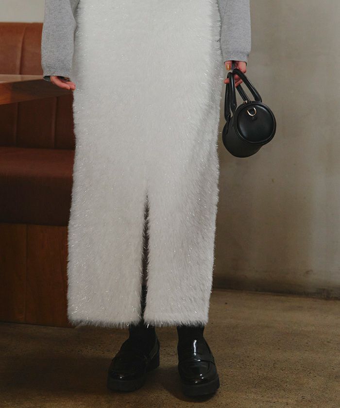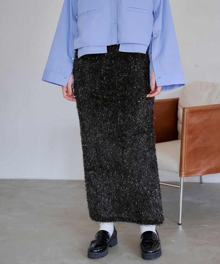 ・毛足長めのフェザーにラメが組み合わさったトレンド感たっぷりのスカート