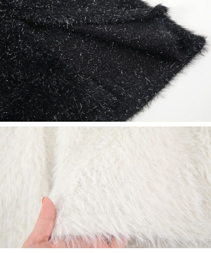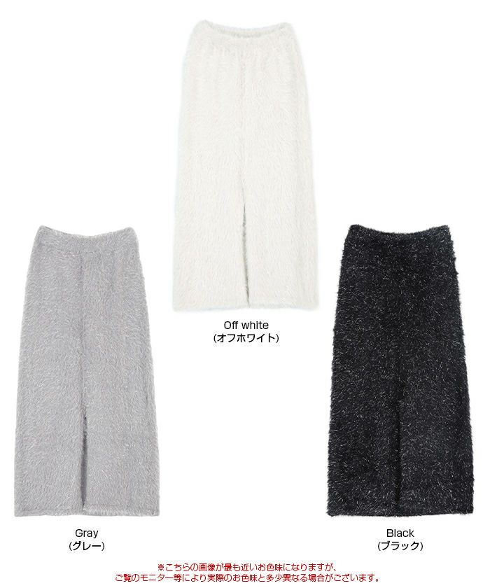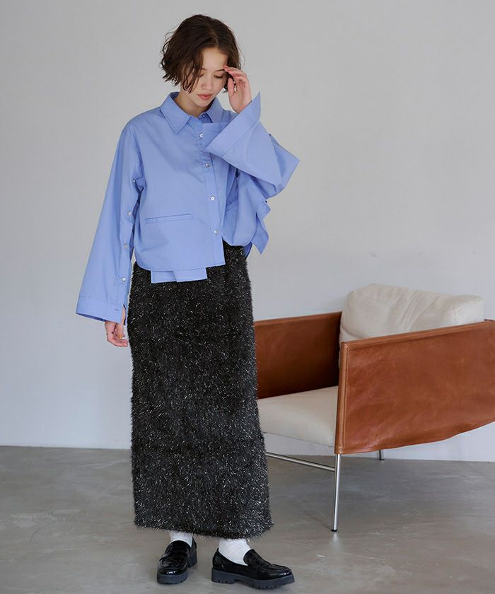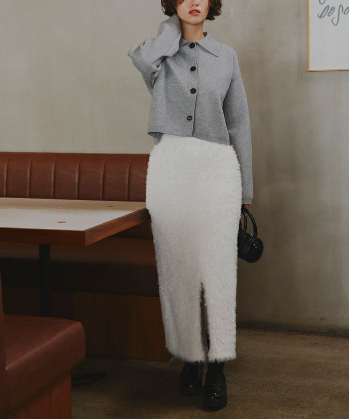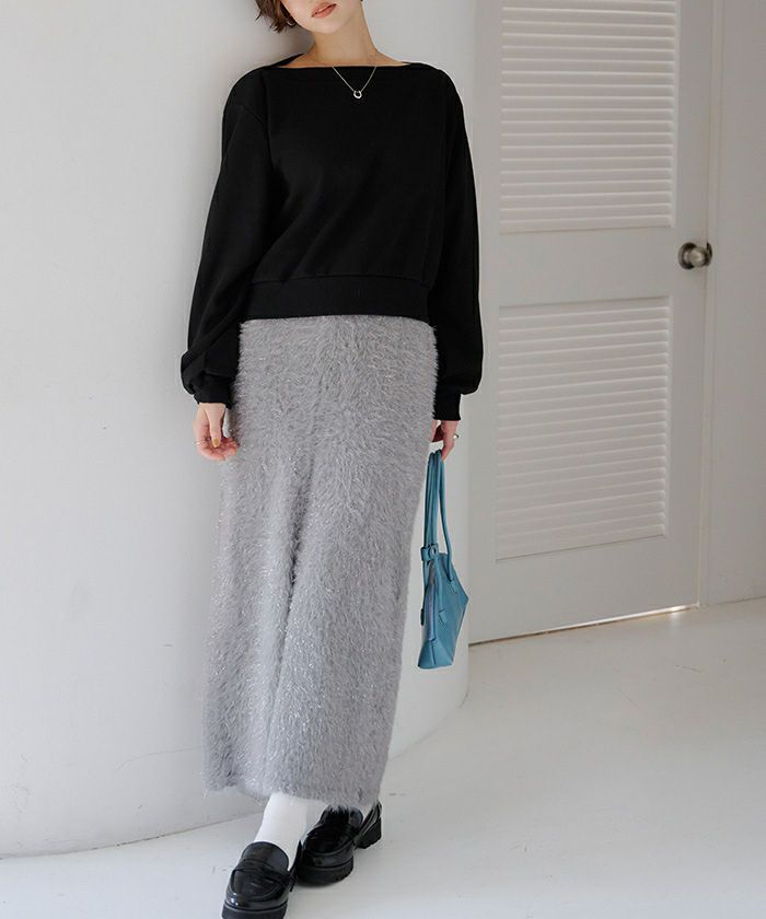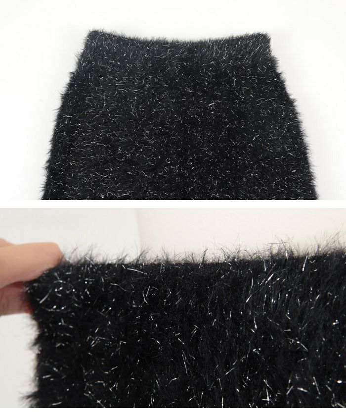 ・毛足長めのフェザーにラメが組み合わさったトレンド感たっぷりのスカート