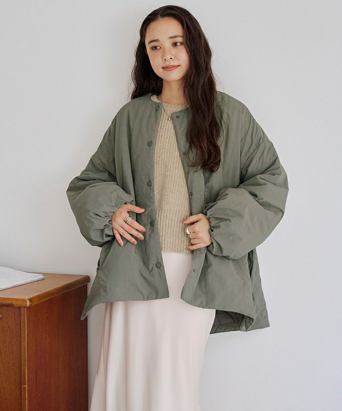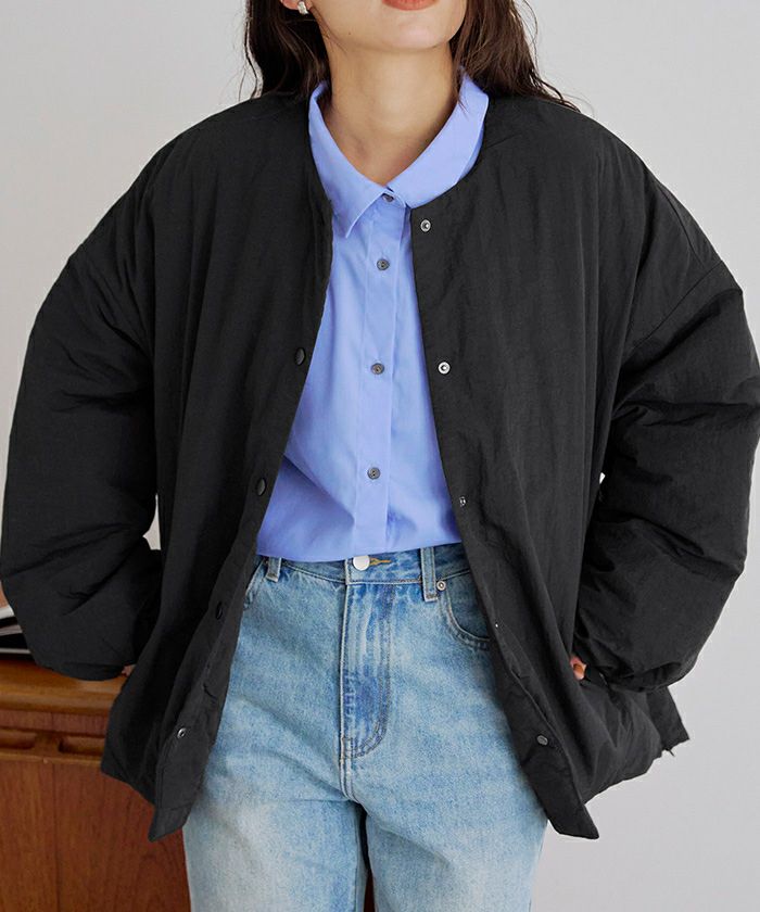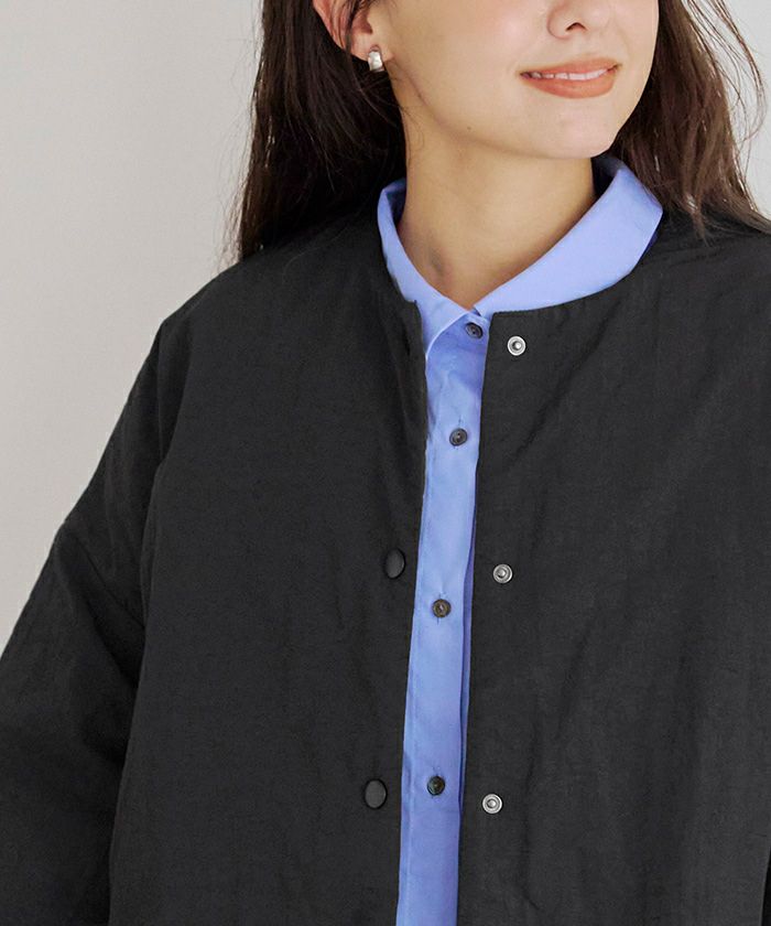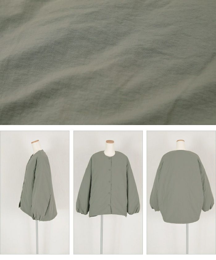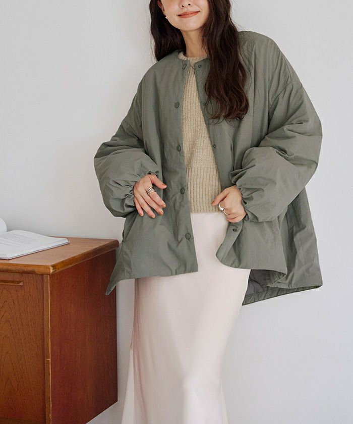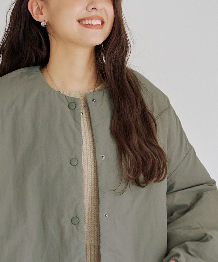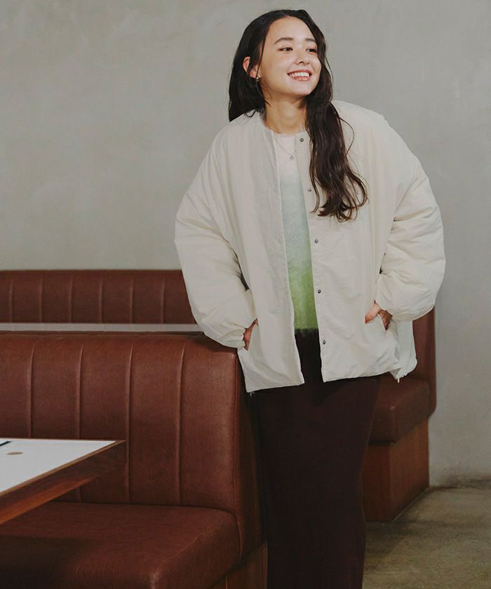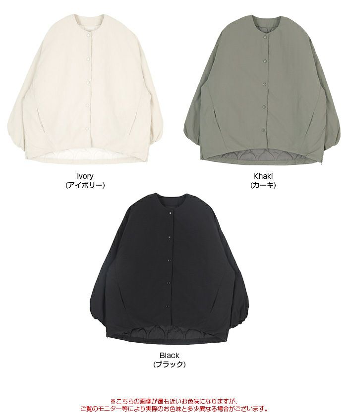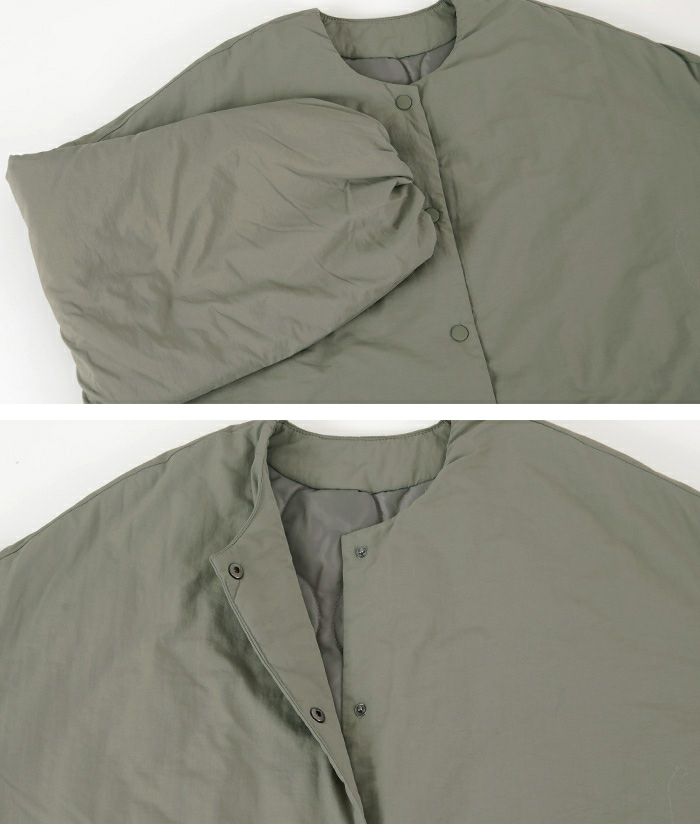 ・ノーカラーなのでフード付きや襟付き、タートルネック等を中に着ても邪魔にならずおしゃれに見せることができます