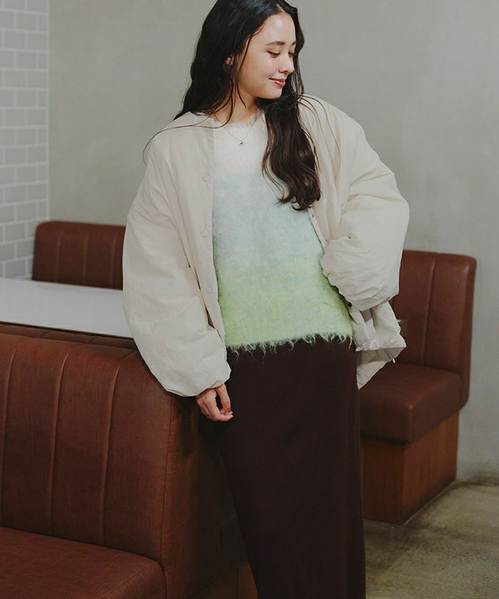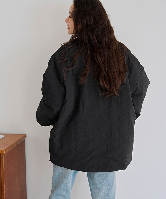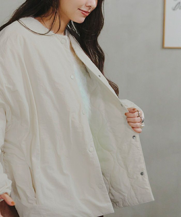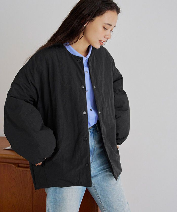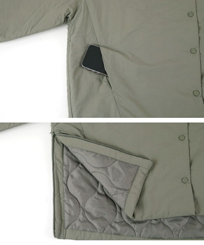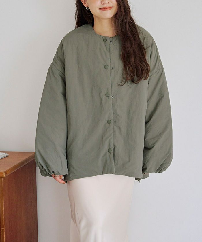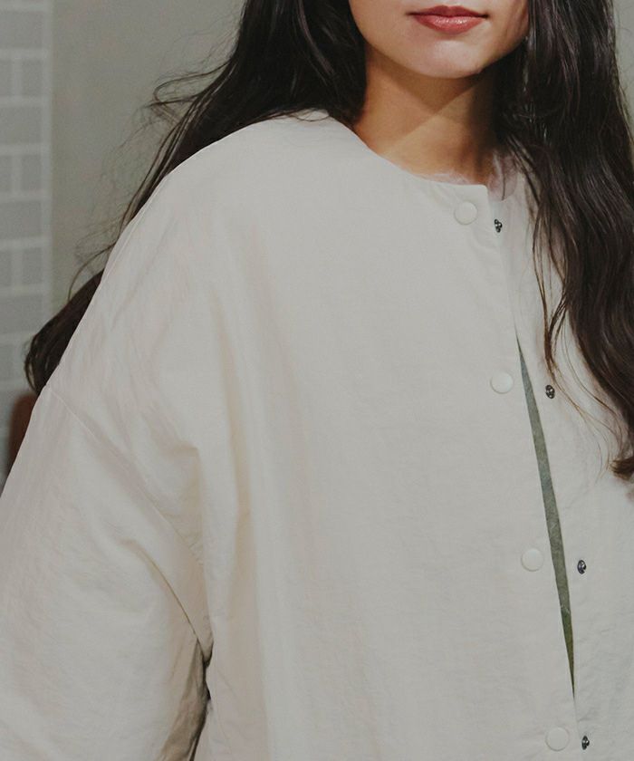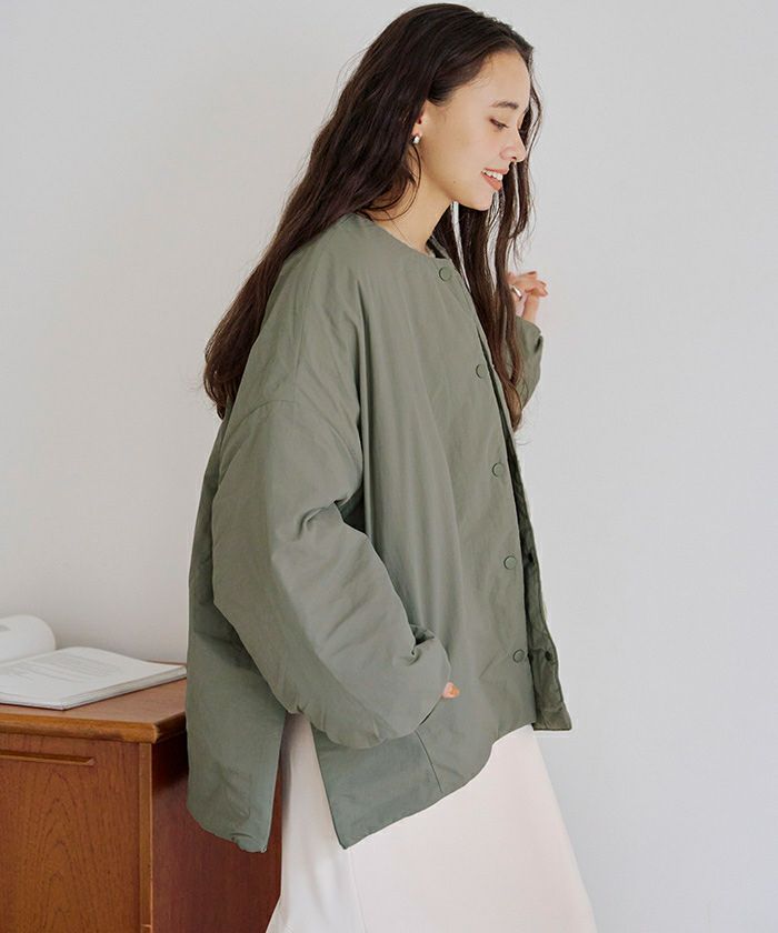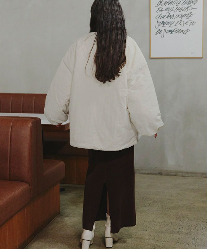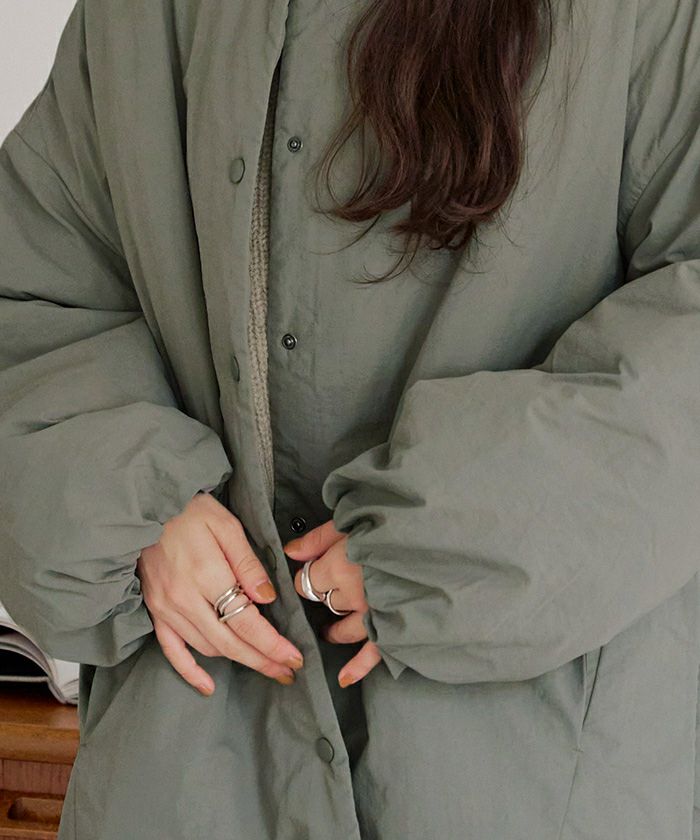 ・ノーカラーなのでフード付きや襟付き、タートルネック等を中に着ても邪魔にならずおしゃれに見せることができます