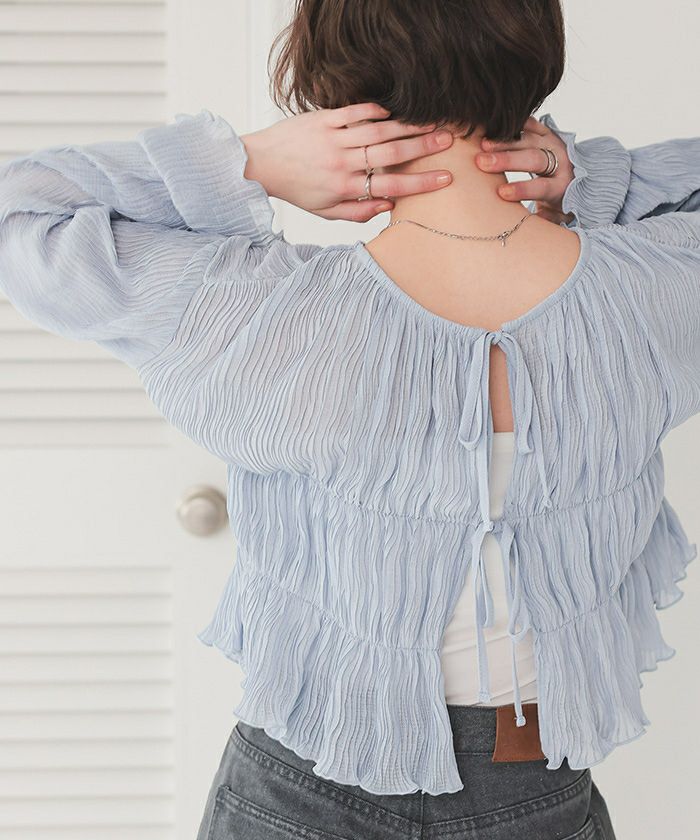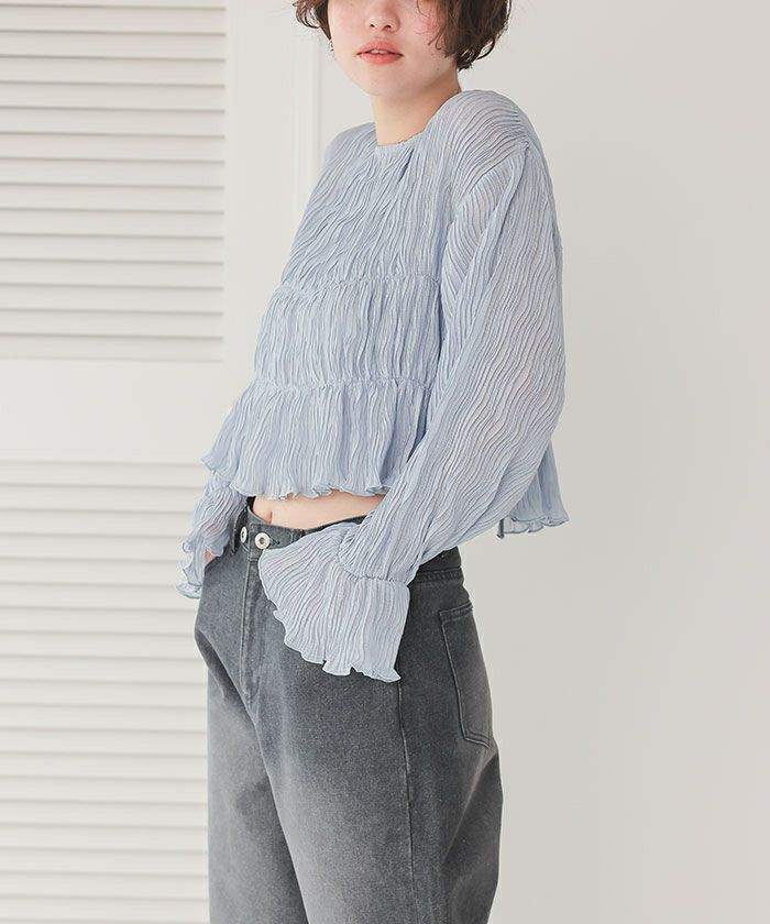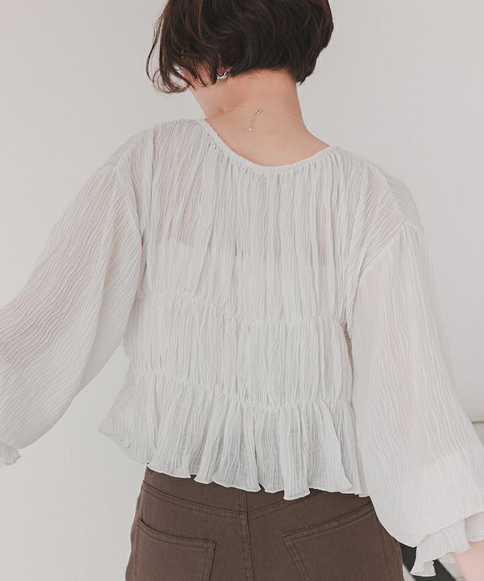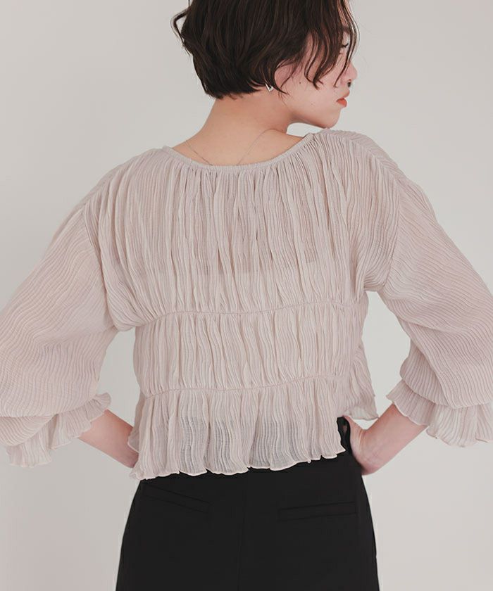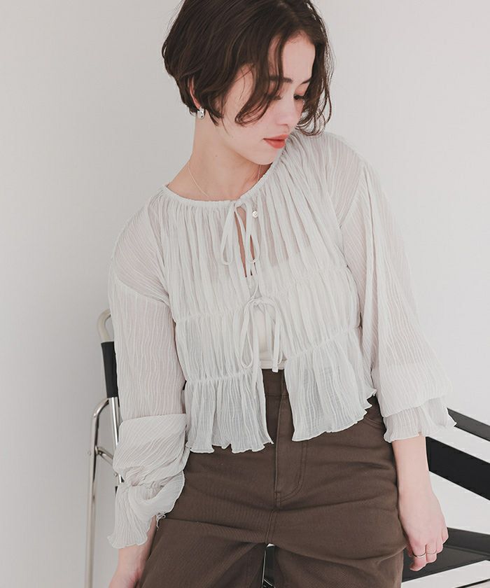 ・繊細なシャーリング加工がポイントのカーディガン。軽やかな透け感が女性らしさを演出