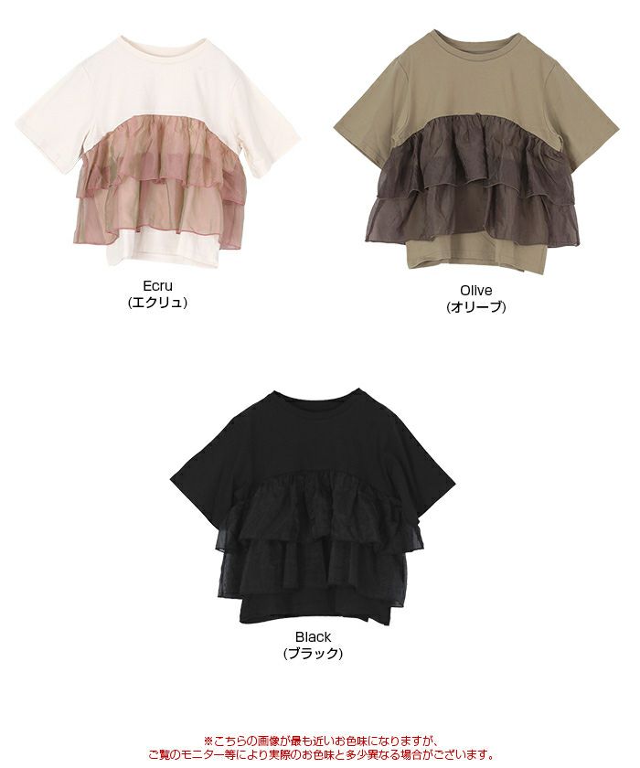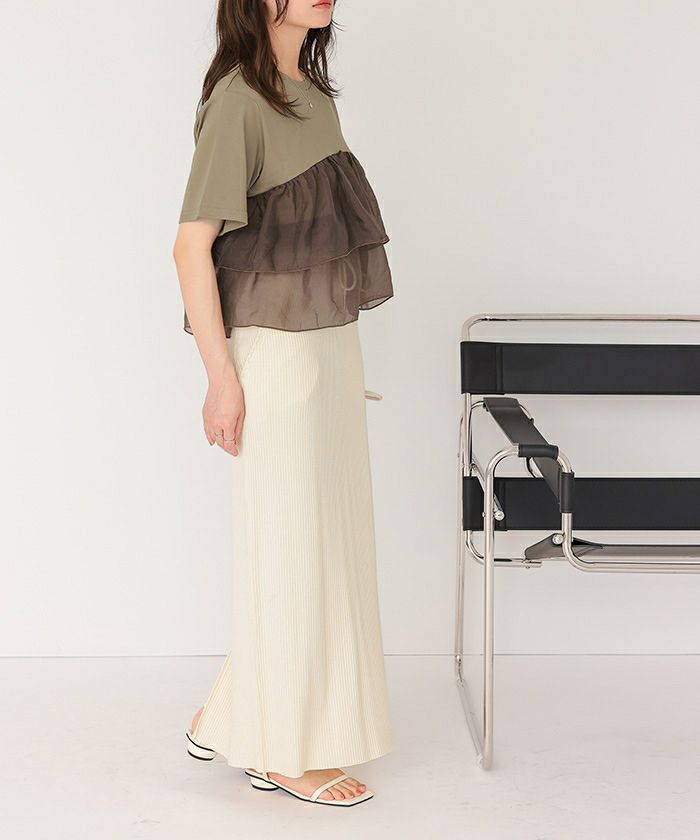 ・カジュアルなTシャツにオーガンジーフリルが目を惹く一着