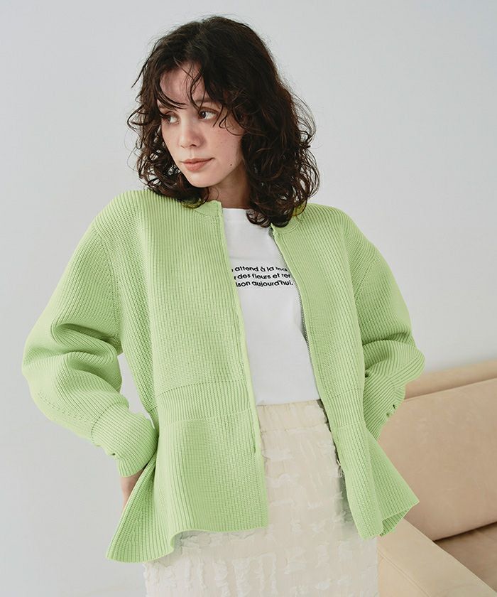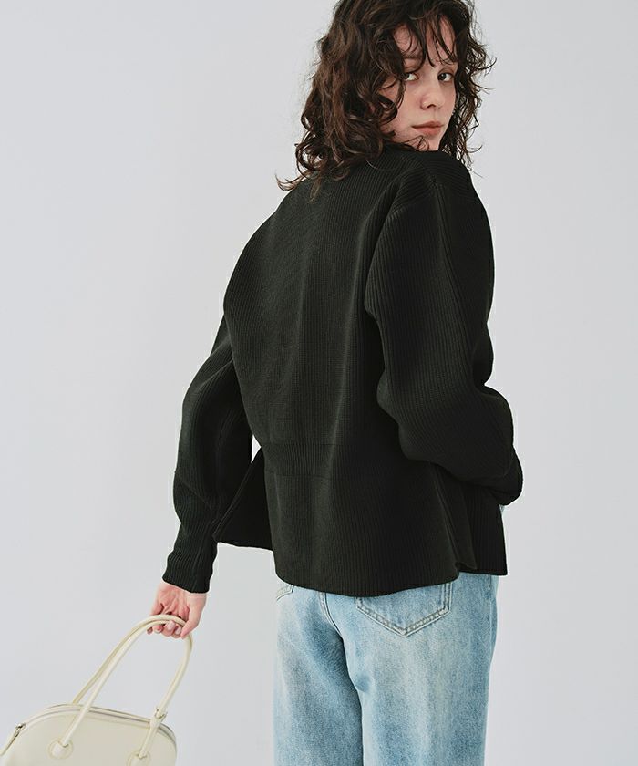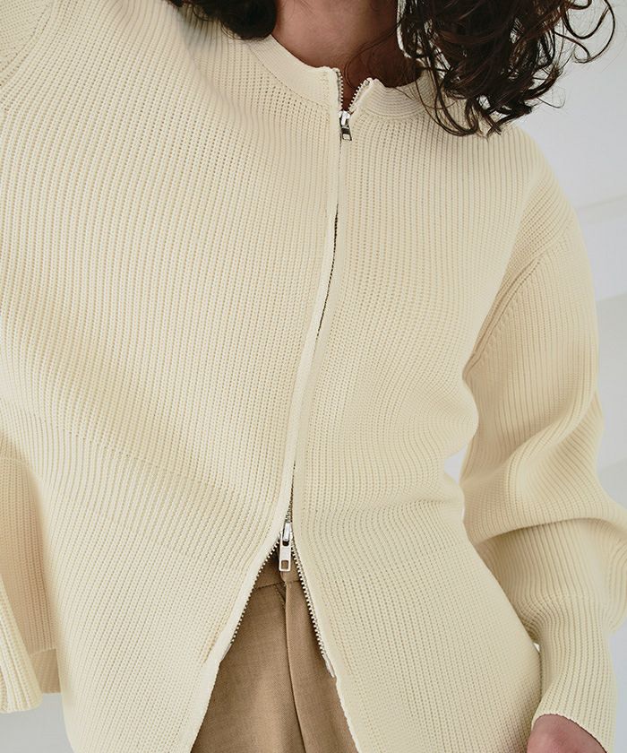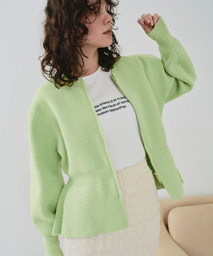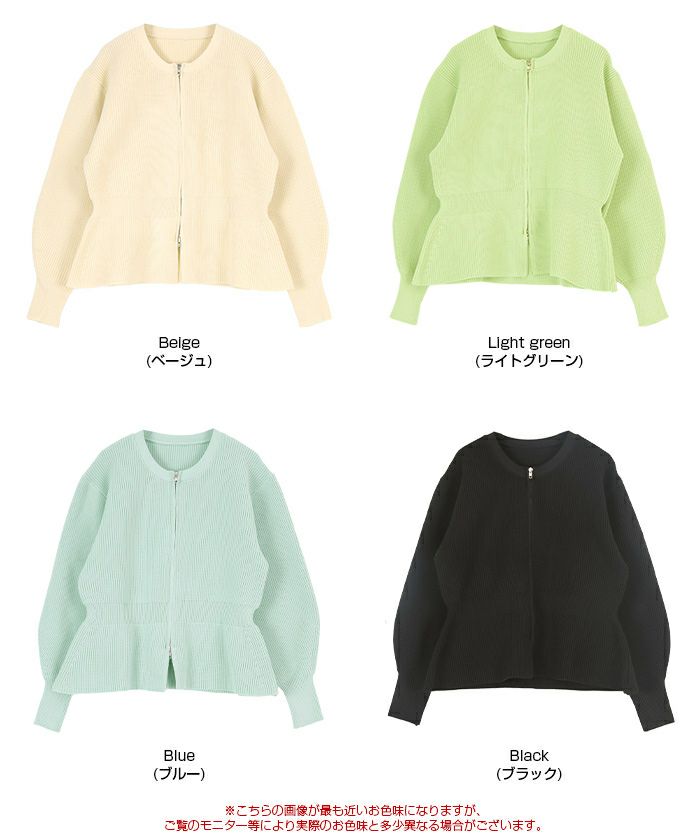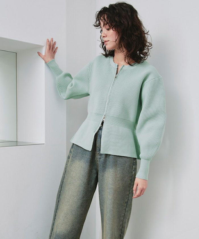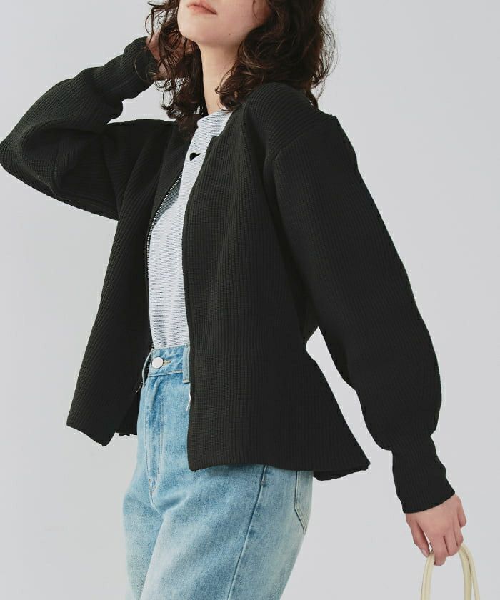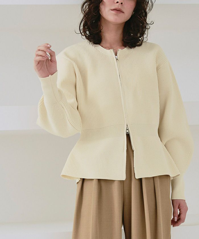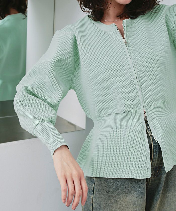 ・ダブルジップ開きのトレンド感あるペプラムニットカーディガン