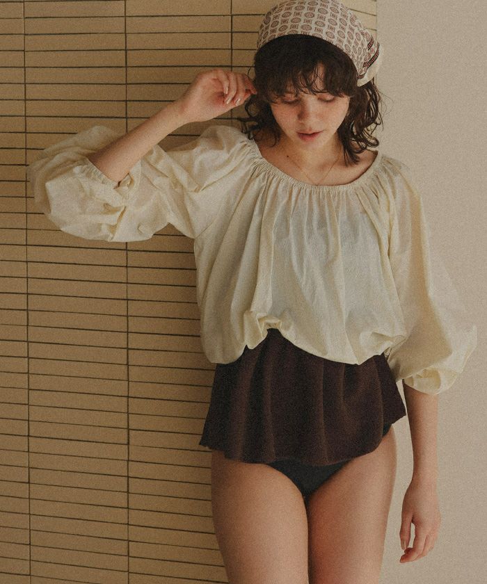 ・シャーリング仕様なので、ノンワイヤーでもフィット感のある着心地です。バックリボンでバスト周りを調整できるので、ストレスなく着用いただけます。
