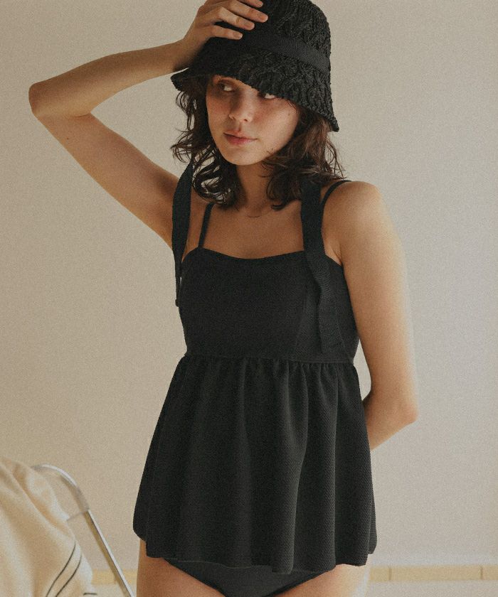 ・大人可愛くカバーアップを叶えるワンピース風セパレートフレアビスチェビキニ。