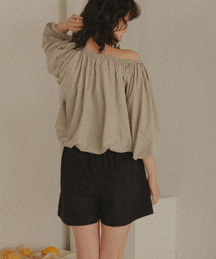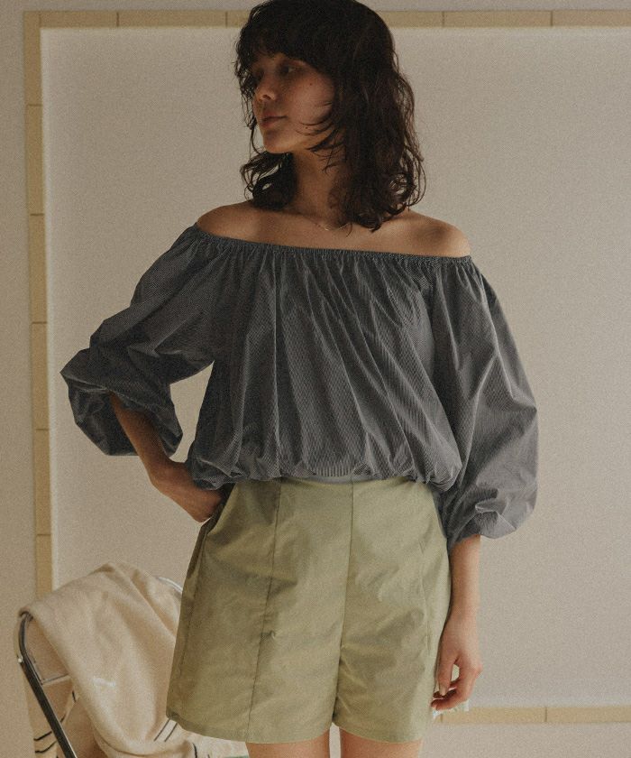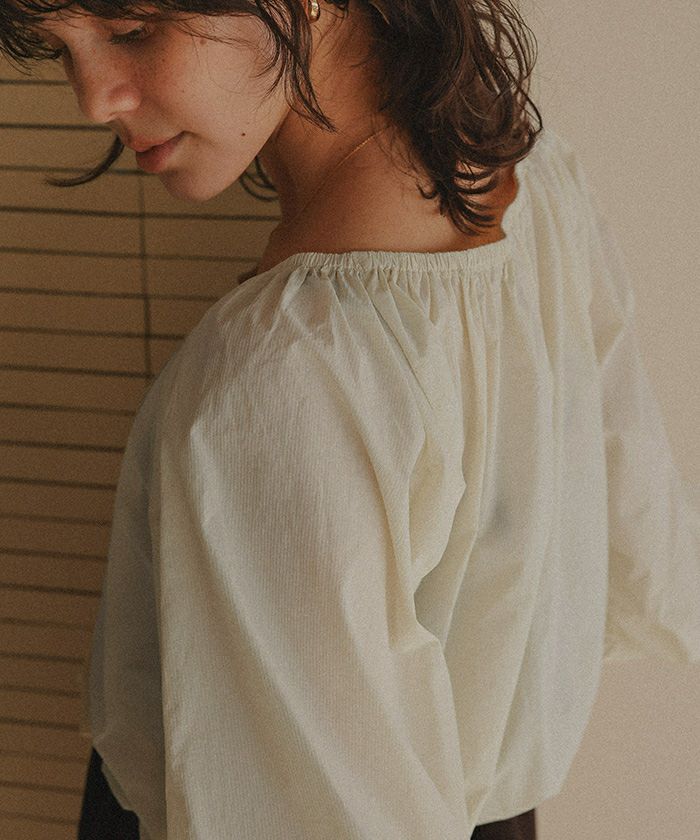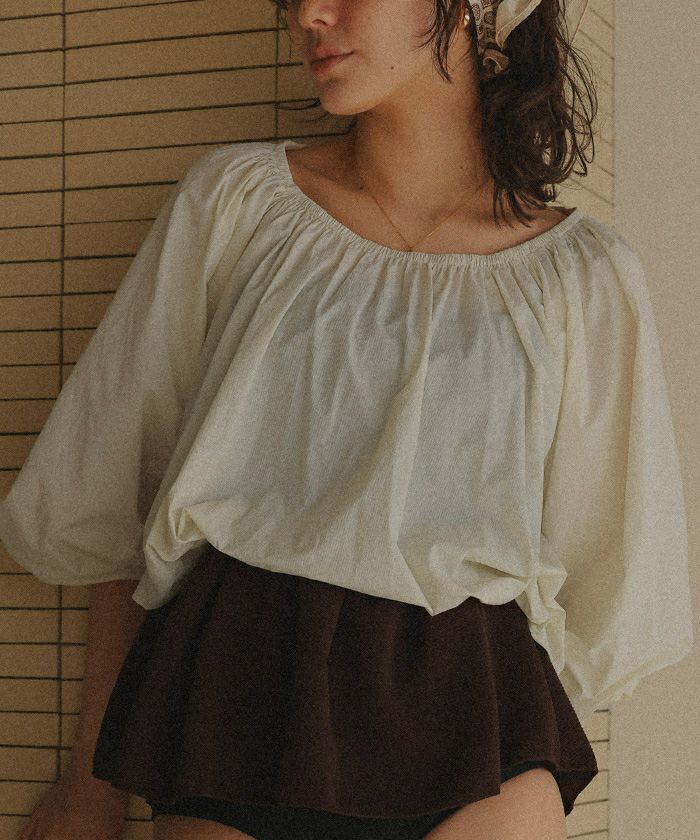 ・ネック部分がゴムギャザー仕様になっているので、ラウンドネックやオフショルダーなどお好きな形でスタイリングが可能です。