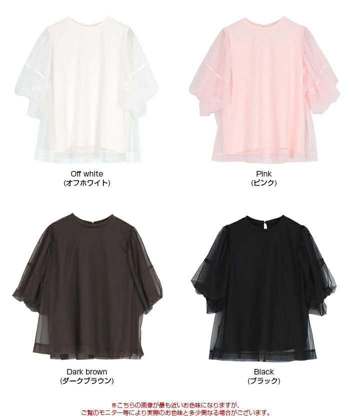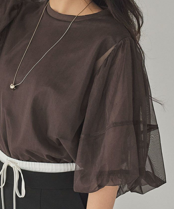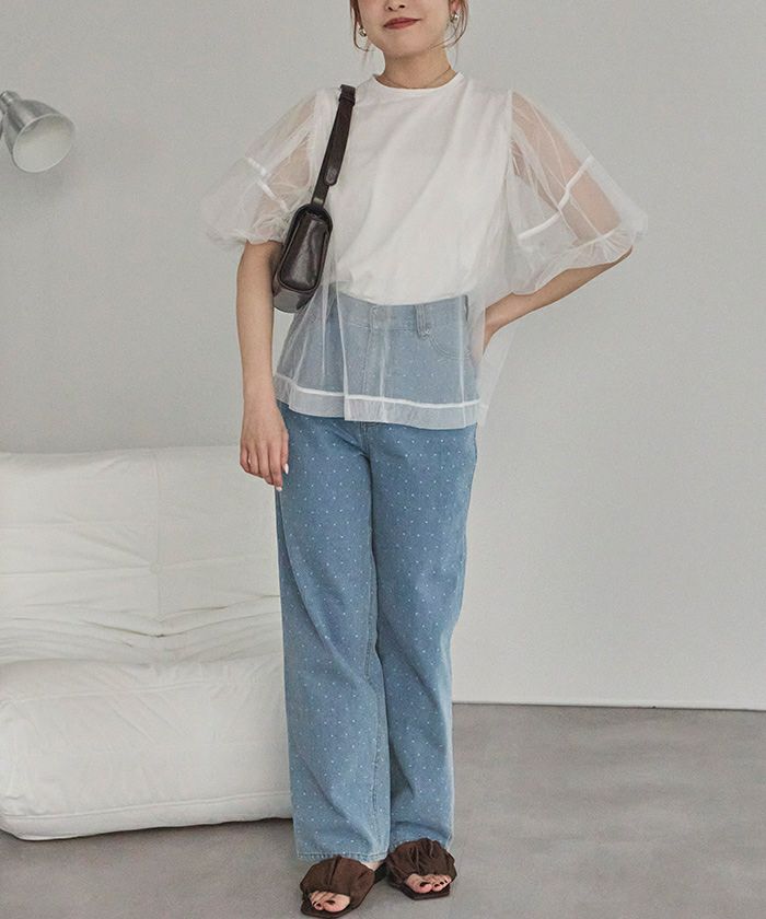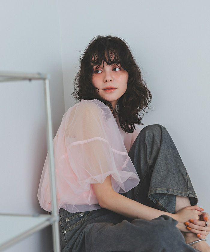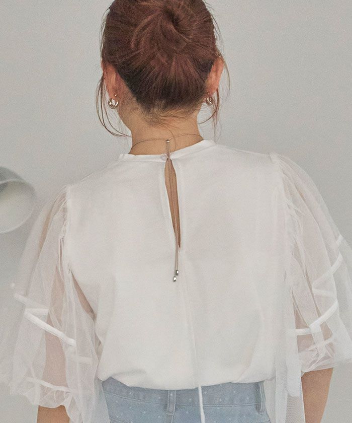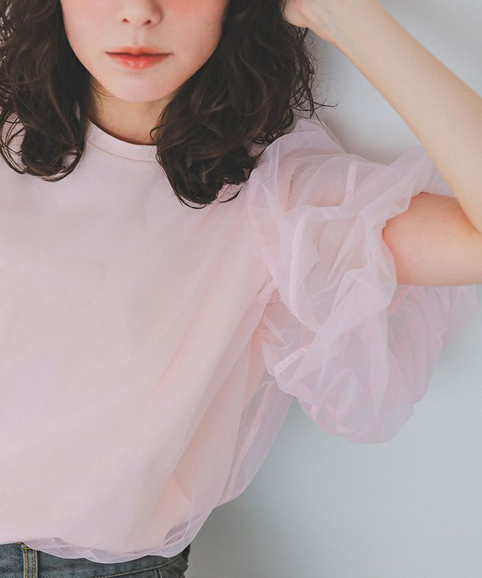 ・チュール素材がレイヤードセットになったふんわりパフスリーブの可愛いトップス