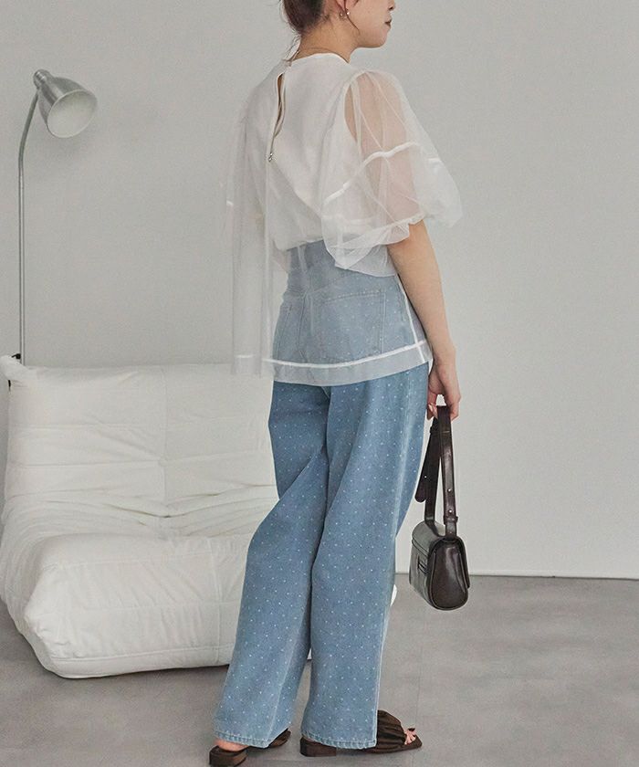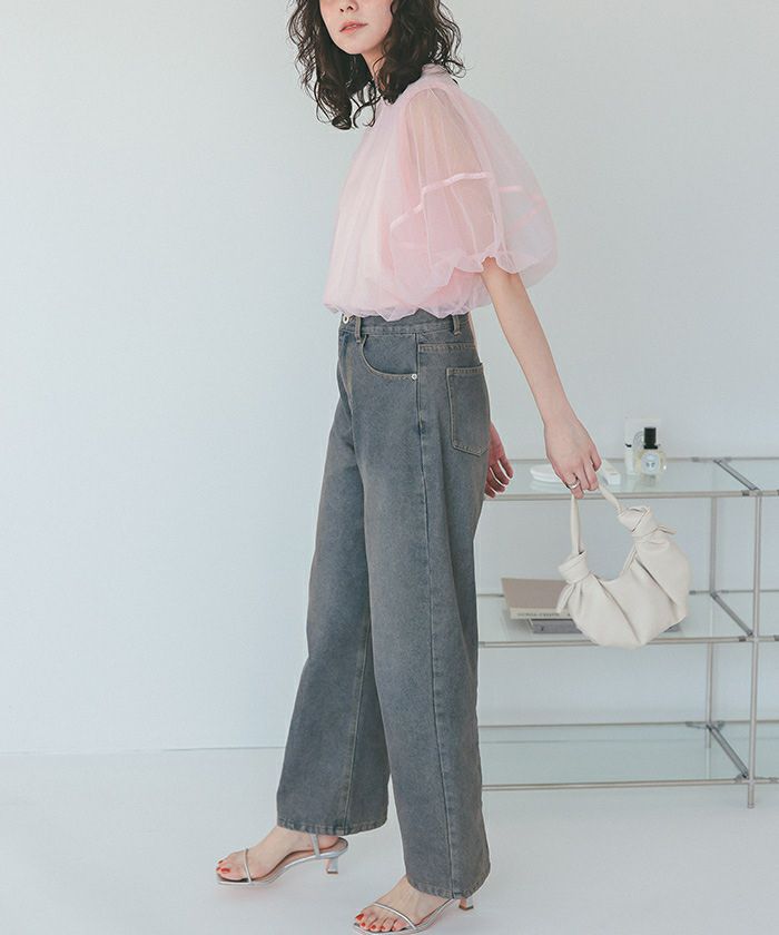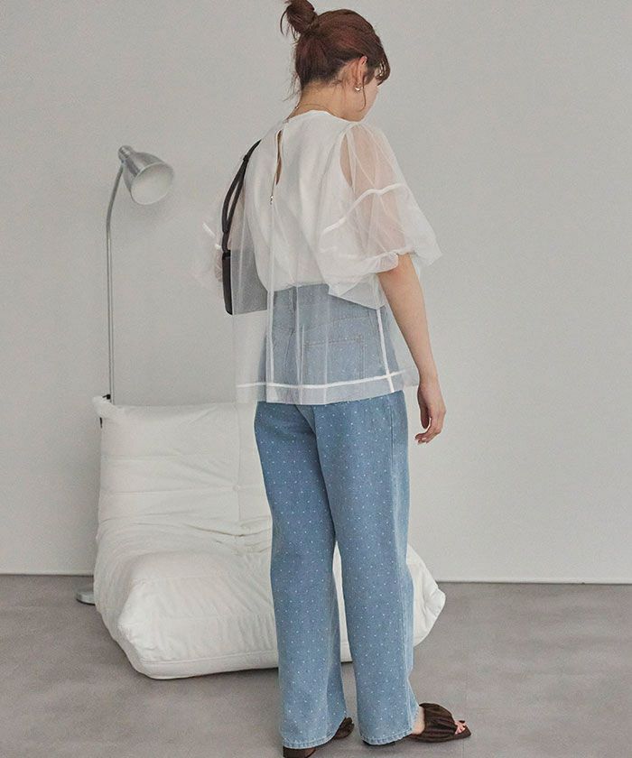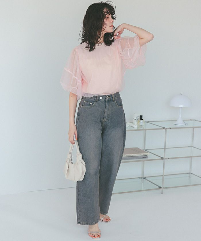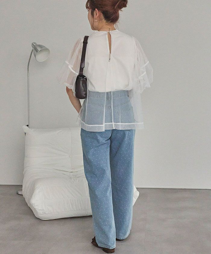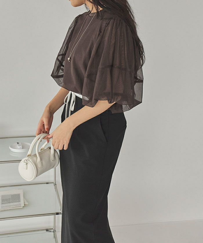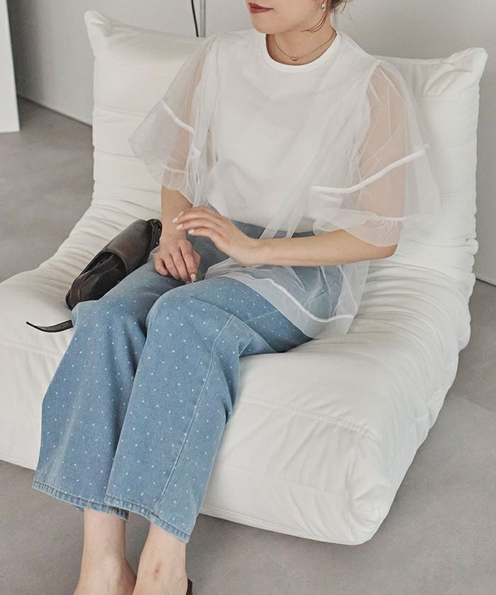 ・チュール素材がレイヤードセットになったふんわりパフスリーブの可愛いトップス