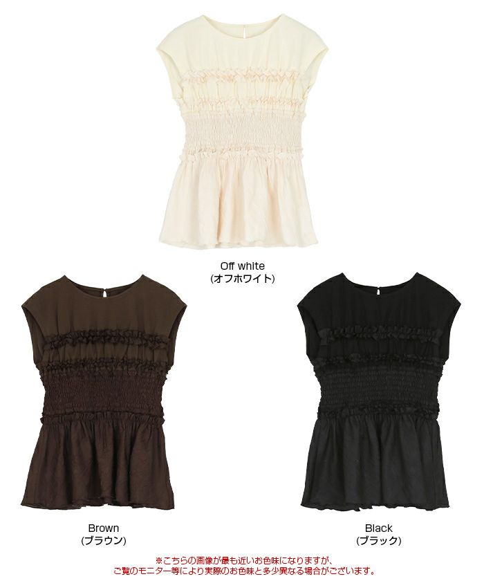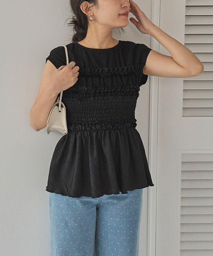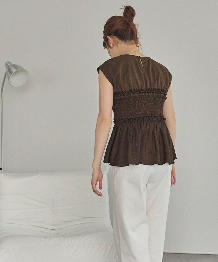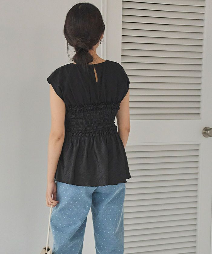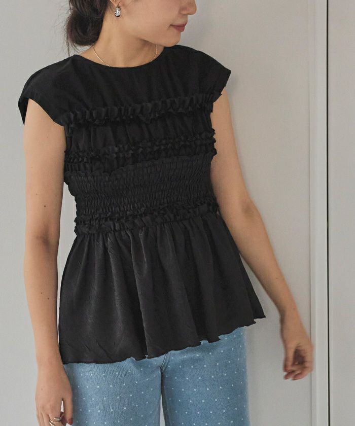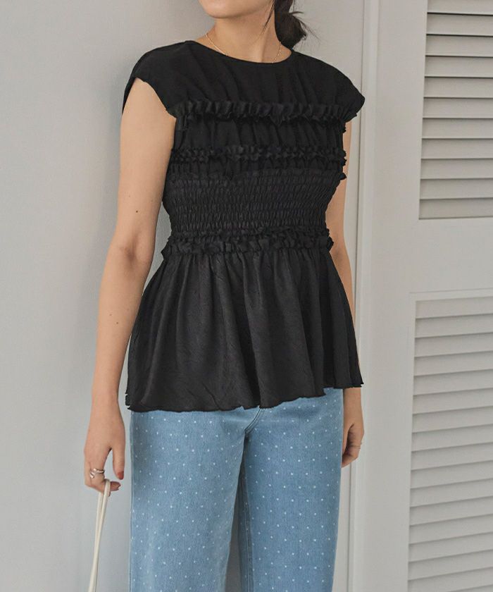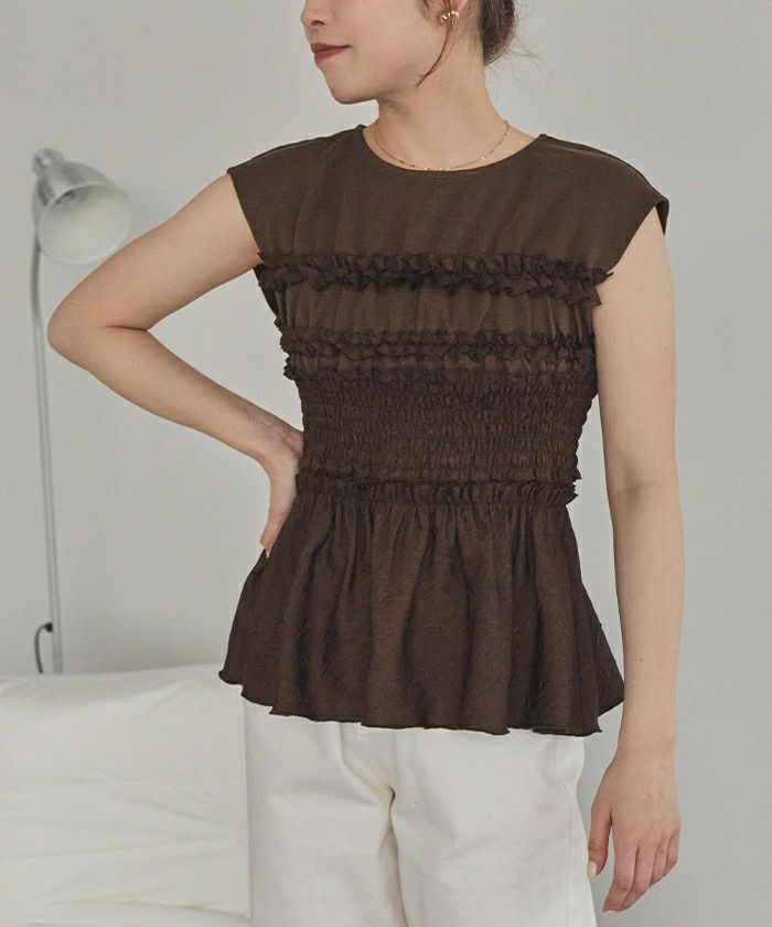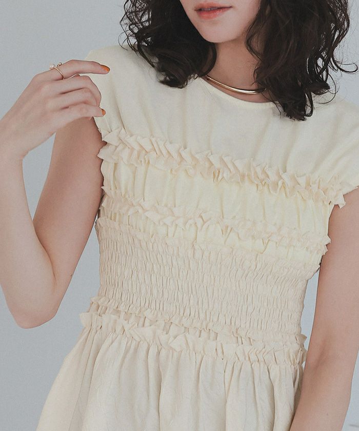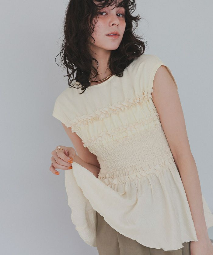 ・カットソーに布帛生地をドッキングした、シャーリングとフリルのディティールが可愛いノースリーブトップス。