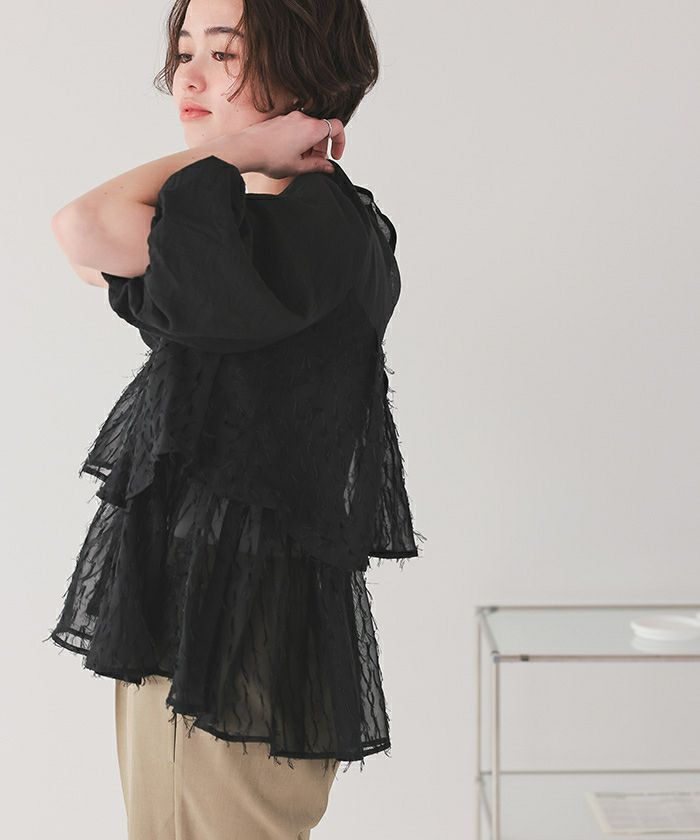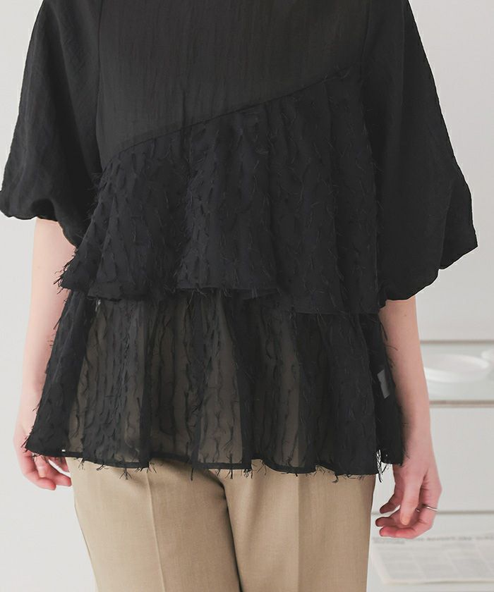 ・シアー感のあるジャガードシフォン素材が軽やかに揺れるドッキングトップス