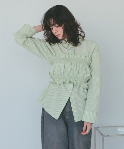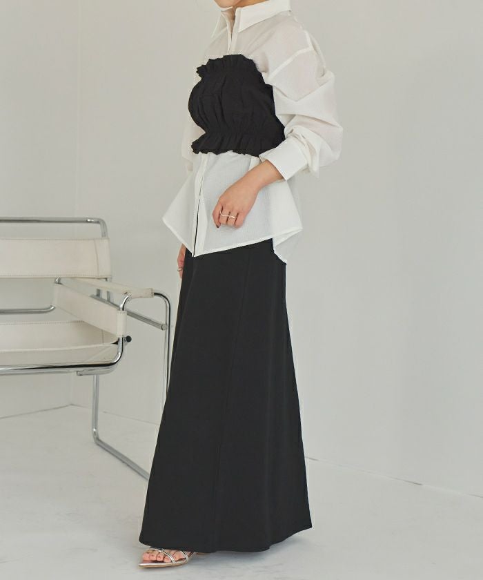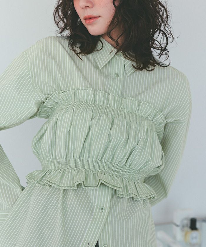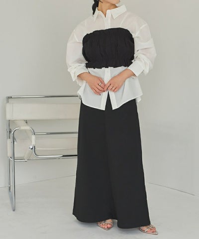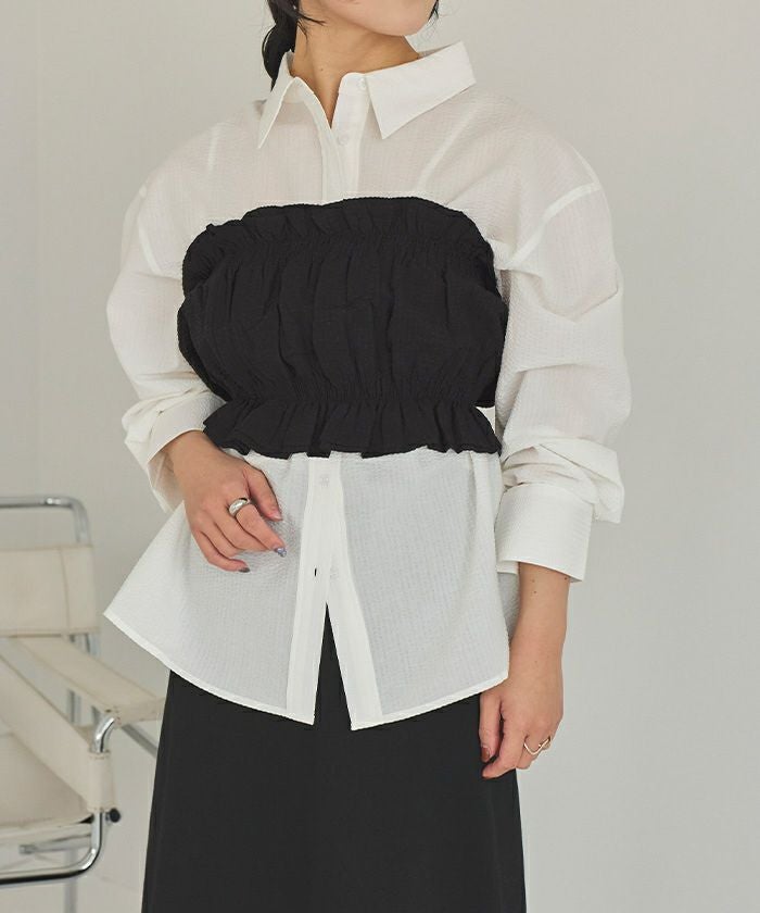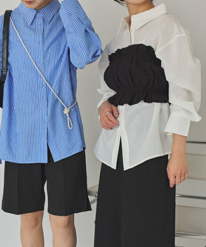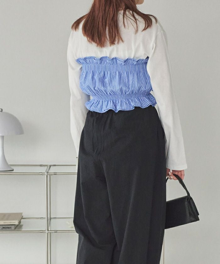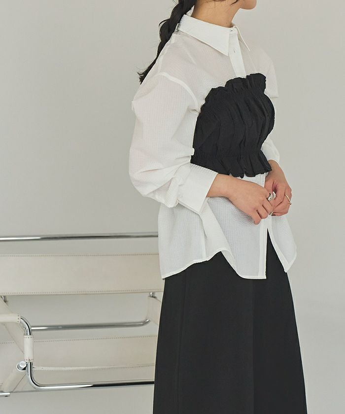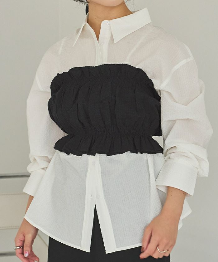 商品情報 ・シャーリングを2段施した、裾のフリルがレディで可愛いビスチェ。