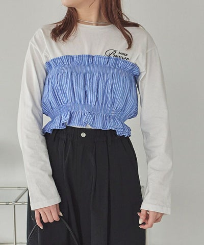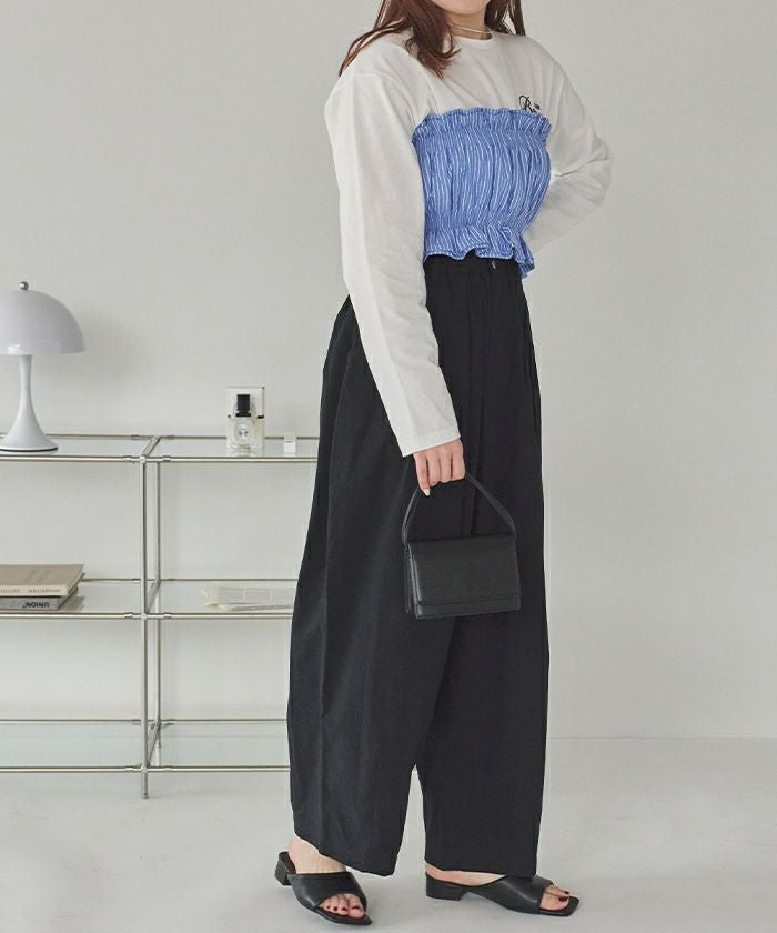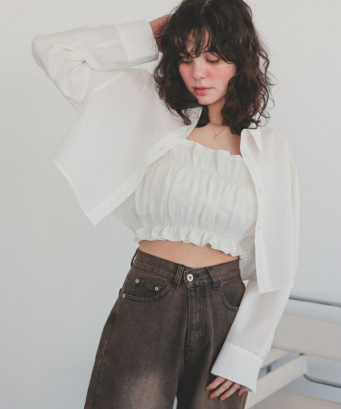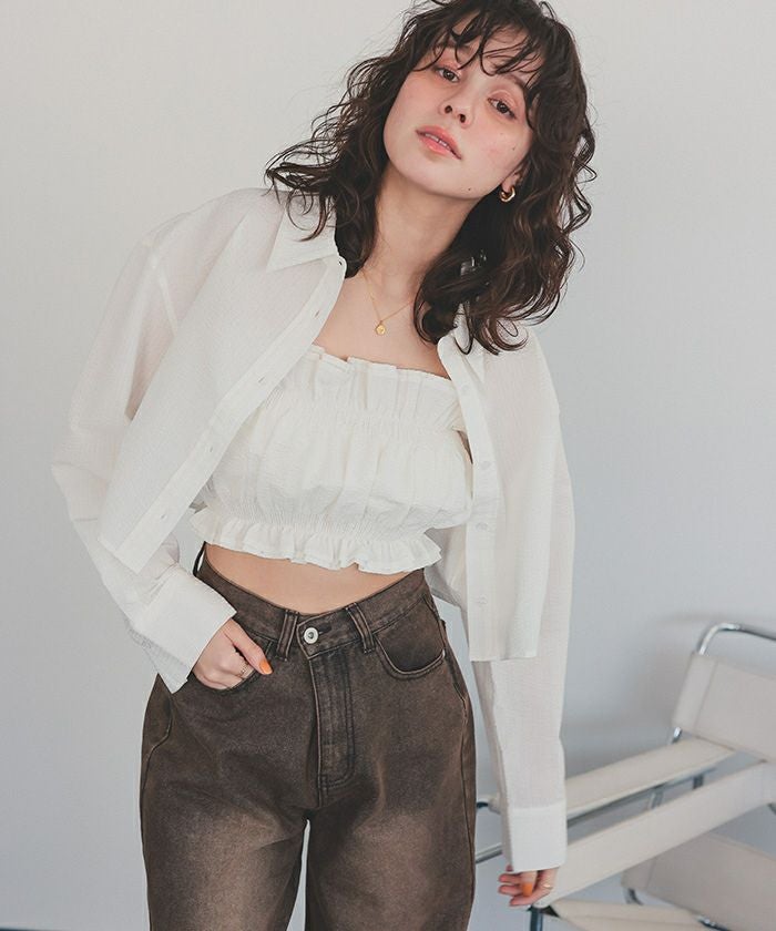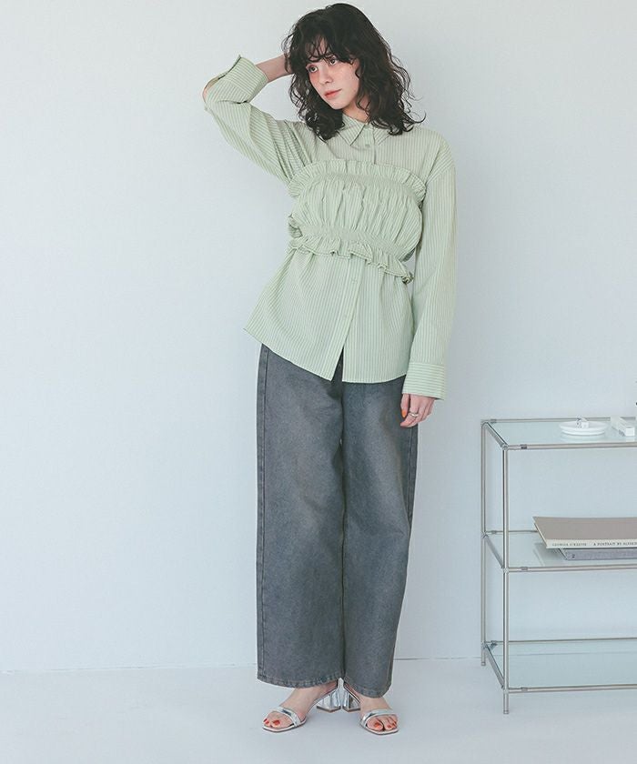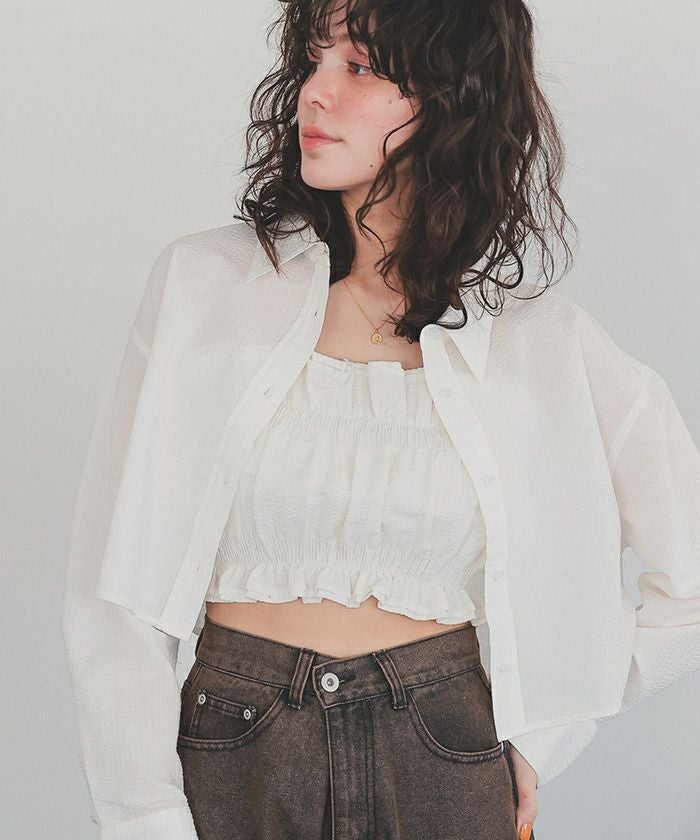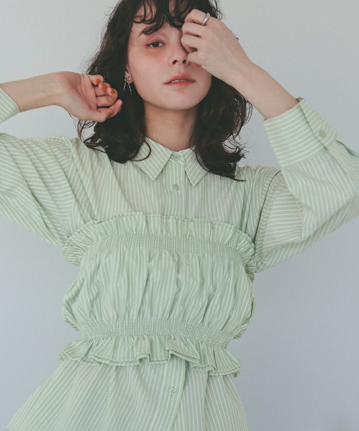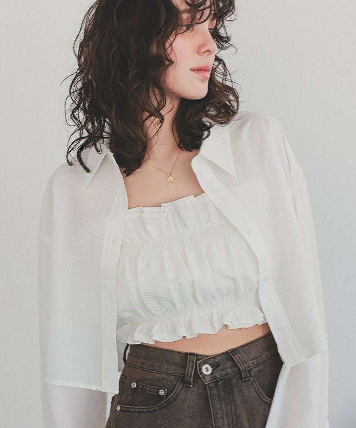 商品情報 ・シャーリングを2段施した、裾のフリルがレディで可愛いビスチェ。