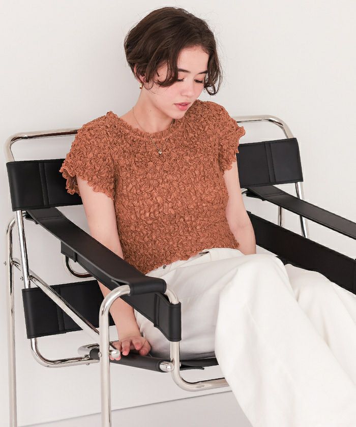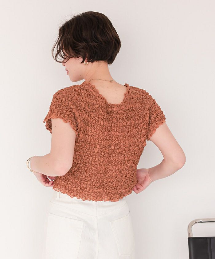 ・ぽこぽこした表面感がポイントの、伸縮性のあるシャーリングシアーTシャツ。