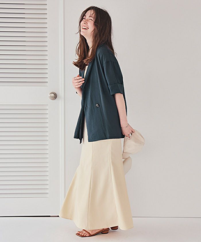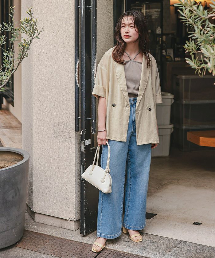 ・綺麗目になりやすいアイテムですが、袖にターンバックデザインが入っているのでカジュアル感が足され、どのシーンでも着やすいデザインになってます
