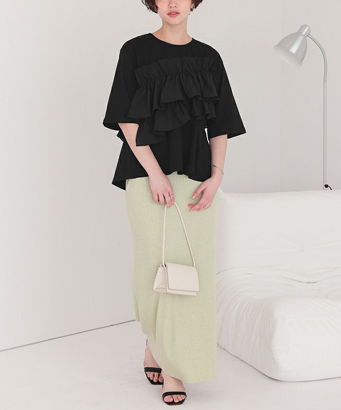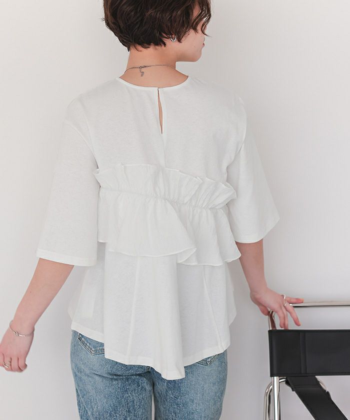 ・アシンメトリーに配置したフリルデザインが華やかに見せてくれる、一枚で着映えするフリルギャザーTシャツ