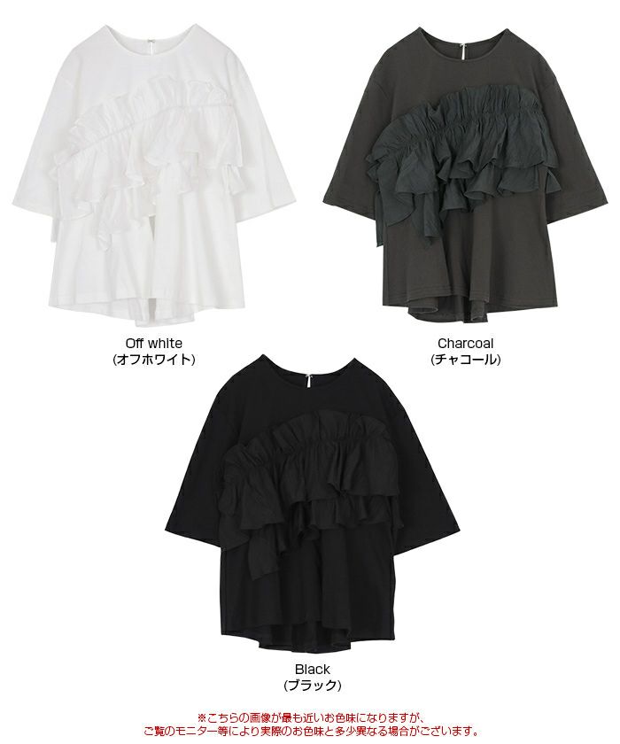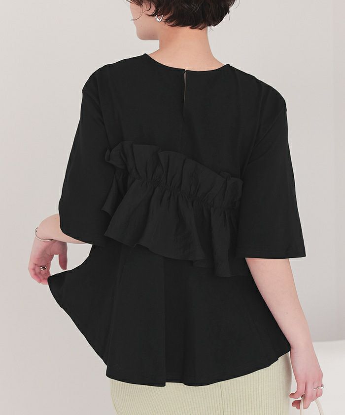 ・肌が触れる本体部分は暑い時期にも着心地のいいカットソー素材になっており、フリル部分はデザイン性と動きのある布帛素材になっております