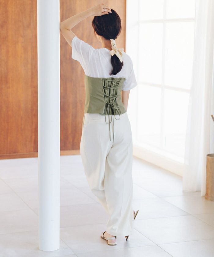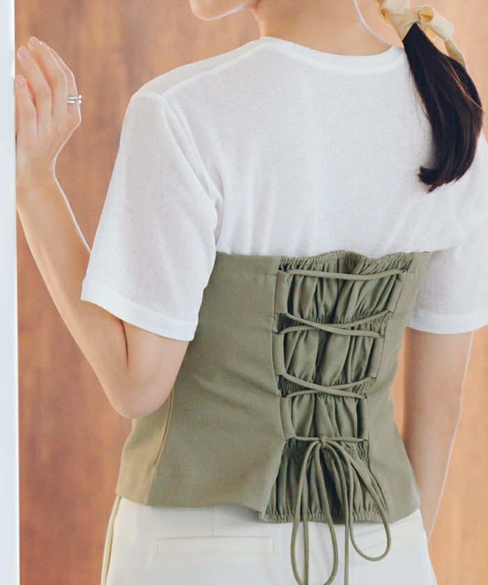 ・後ろはシャーリング仕様になっており、体のフィット感はレースアップリボン部分で調整可能です