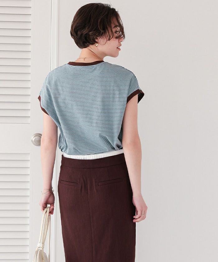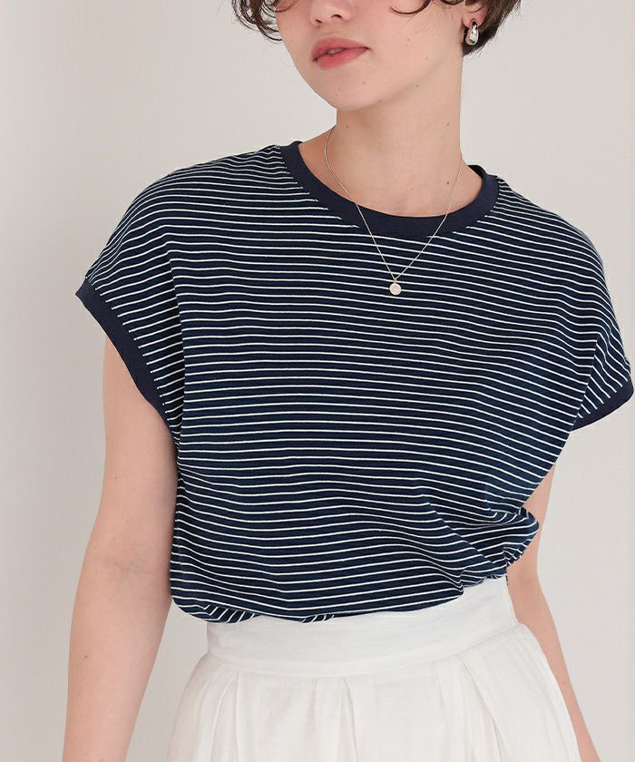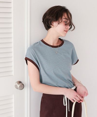 アイボリーのM購入。襟と袖の黒パイピングと細ボーダーが大人っぽくおしゃれ。コンパクトでジャケットやシャツのインナーにも合わせやすい。とても気に入りました。