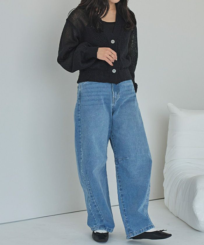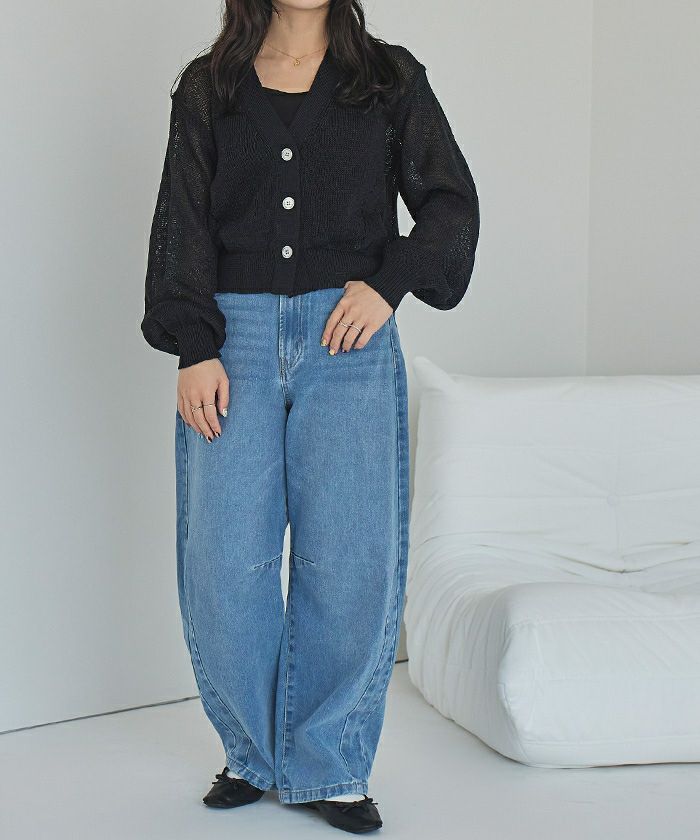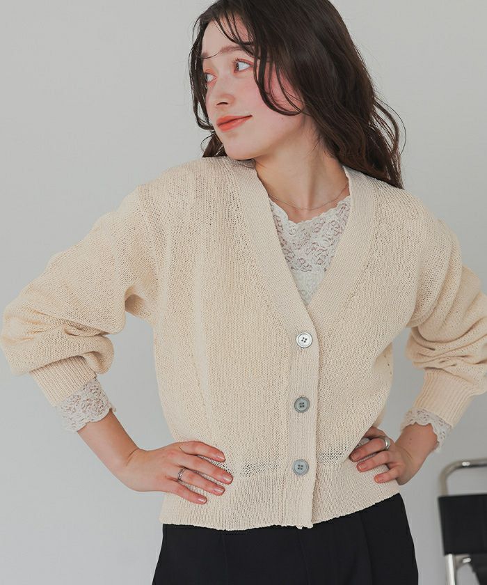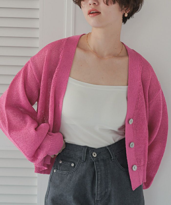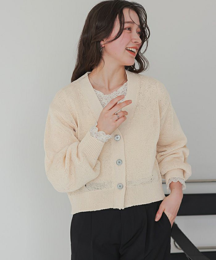 ベーシックな形なので、色々なアイテムと合わせやすいです。 ざっくりとした編地のニットで通気性が良いので、真夏の冷房対策にも使えそうです。