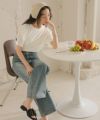 ・肩から裾にかけてラッフルデザインが程よく女性らしく、スタイリッシュな雰囲気に。シンプル過ぎない、一枚で様になるTシャツに。