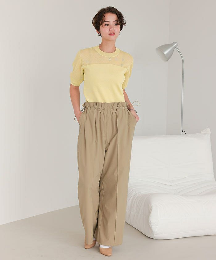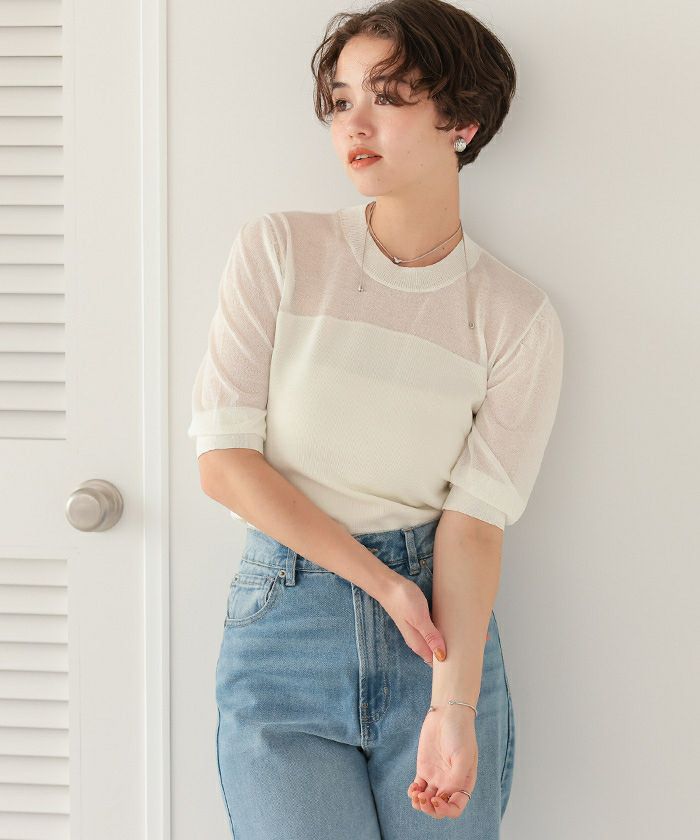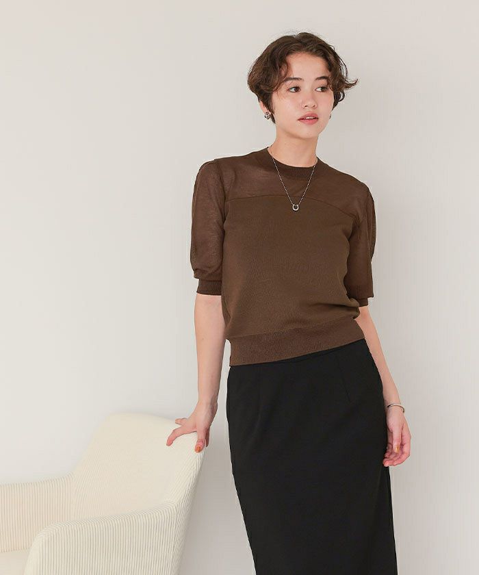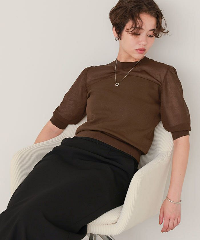 シアー切替パフスリーブニットトップス