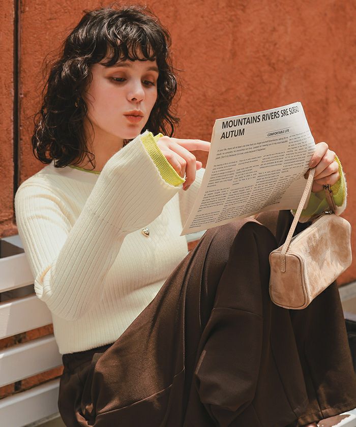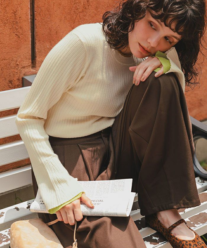 ただの白ニットじゃなくて、ワンポイントカラーがオシャレ。袖からチラ見えしてて重ね着感が上級者っぽい。