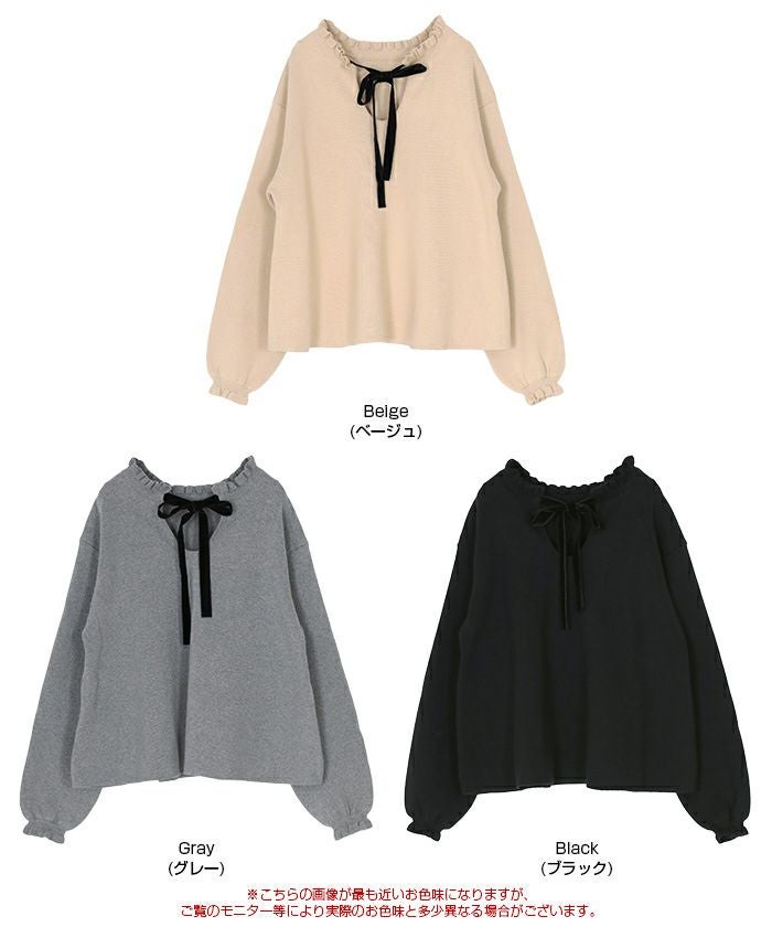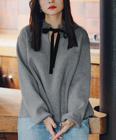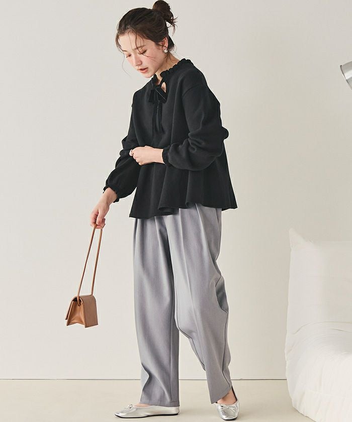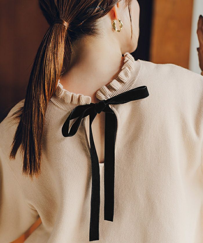・上質感のあるベロアリボンを襟もとにあしらい、高見えディテールに仕上げた一枚