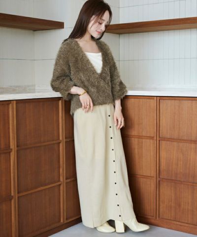 ・縦のラインを強調するフロント釦が印象的な、上品Iラインスカート