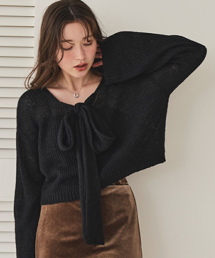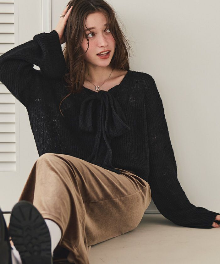 前後2wayリボンデザインシアーローゲージニット