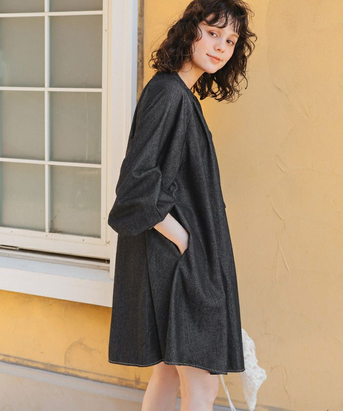 ・《バンドカラーが今っぽい》大人カジュアルに映えるこなれ感のあるデニムワンピース