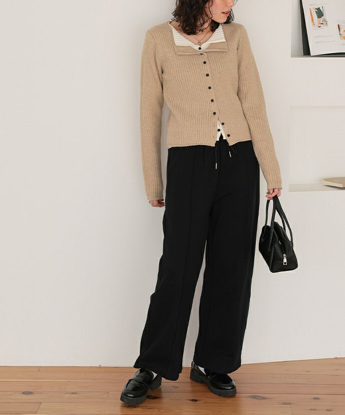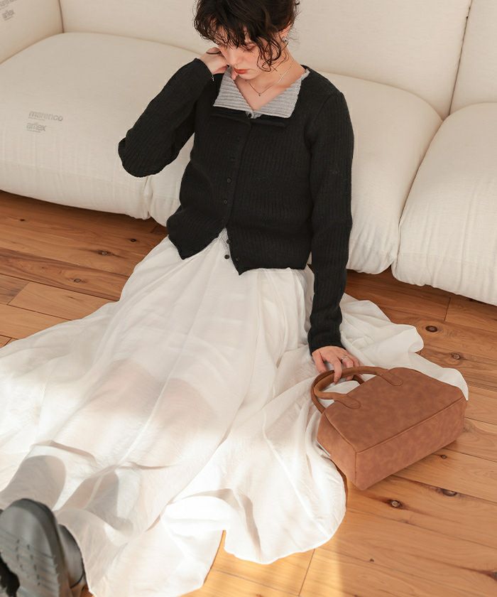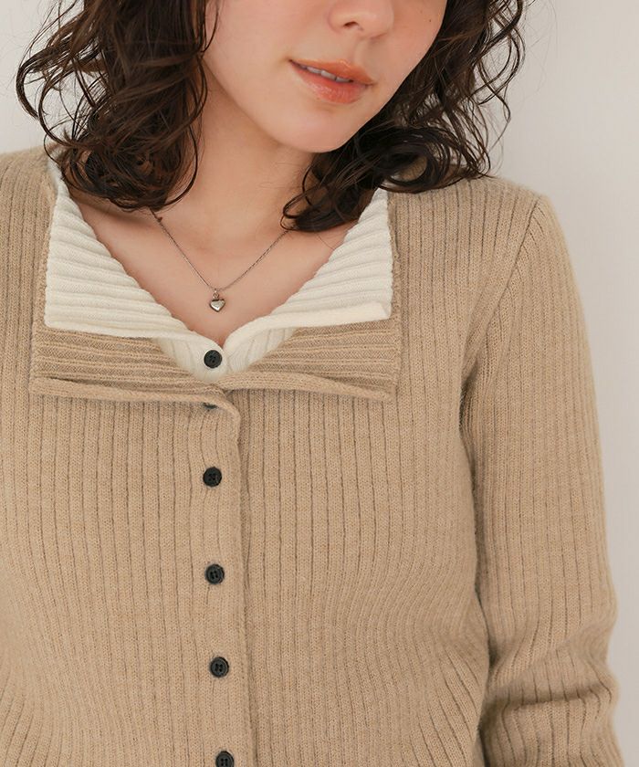 重ね襟がおしゃれです。前部分のセーターが2枚になっています。一枚だと、寒い季節になってくるので、ヒートテックを切るつもりです。首周りが開いているので、ヒートテックは首元が見えないものにした方が良さそうです。茶色と水色の組み合わせがチョコミントみたいで、すごく気に入っています。