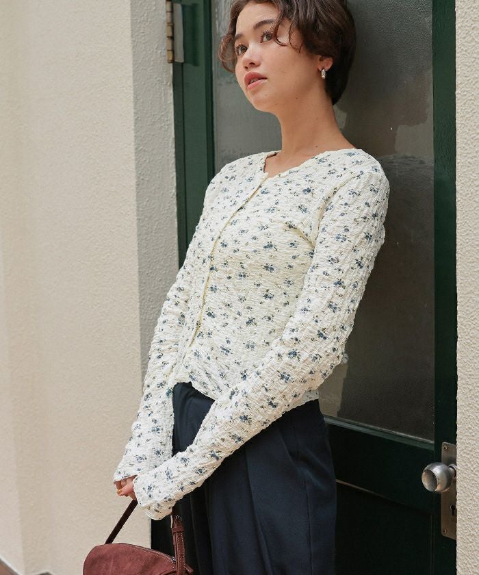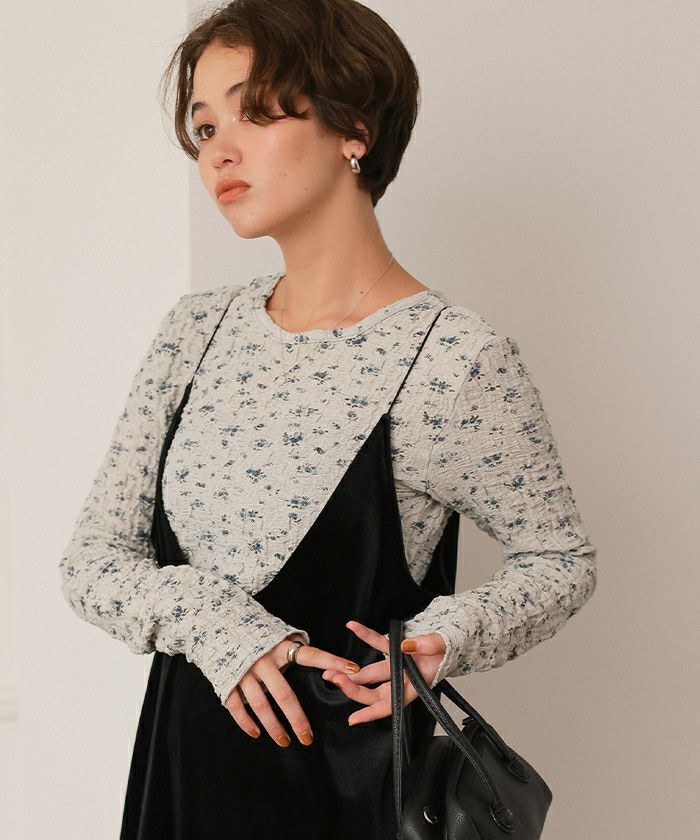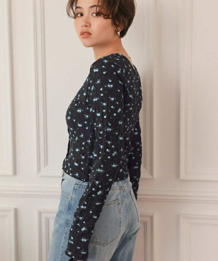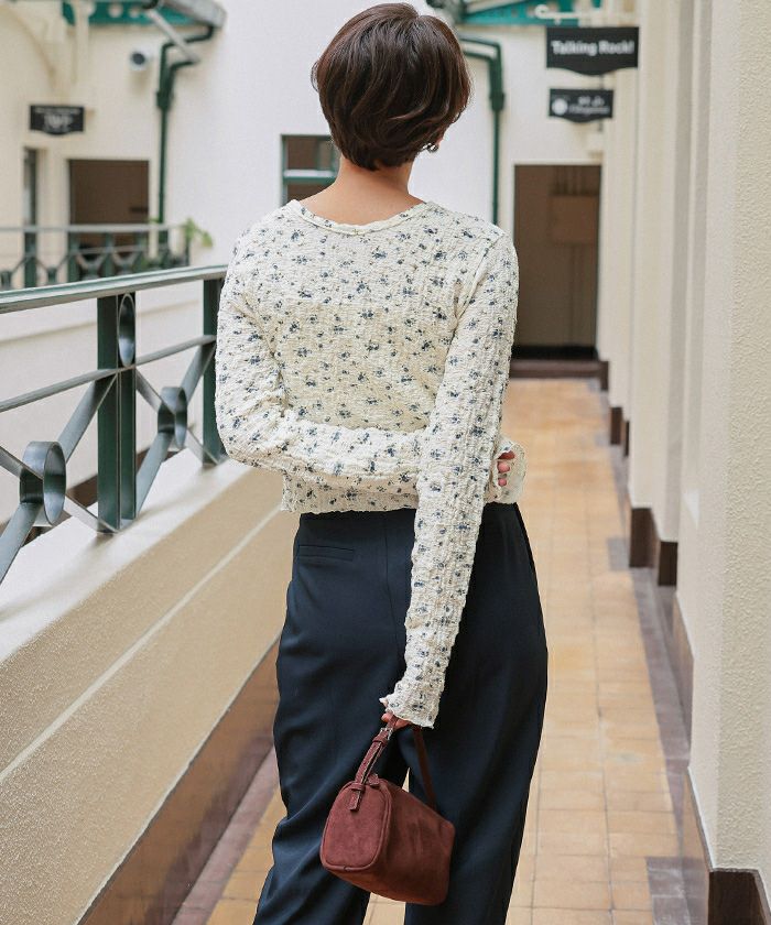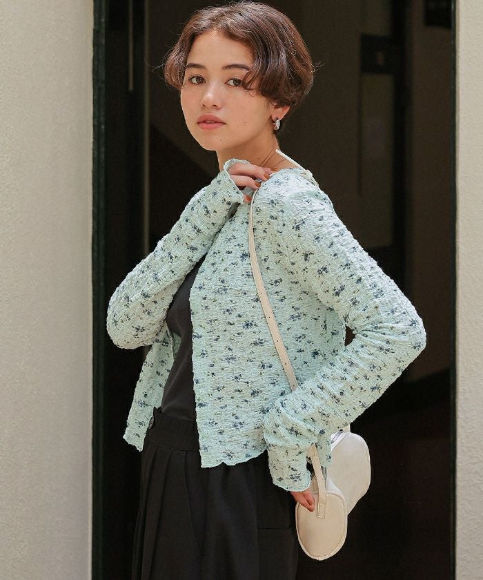 ・凸凹した表面感のある素材に、トレンド感のあるフラワープリントが施された生地で可愛い