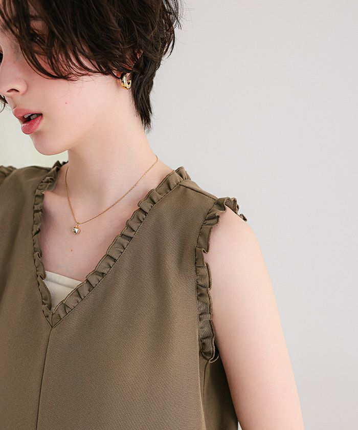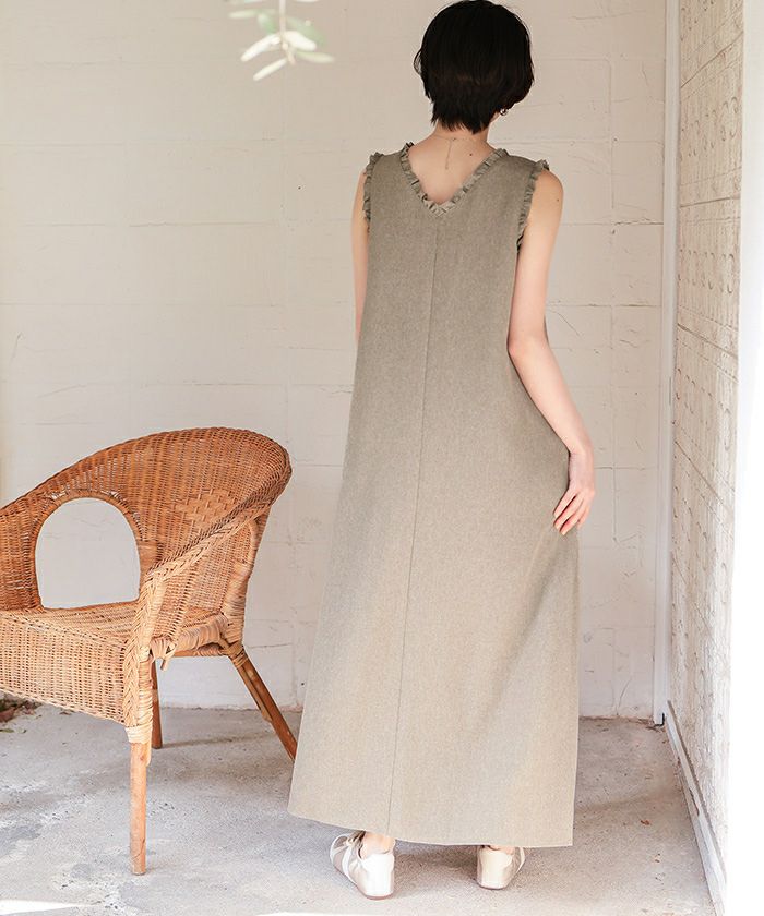リネンライクVネックフリルデザインノースリーブワンピース
