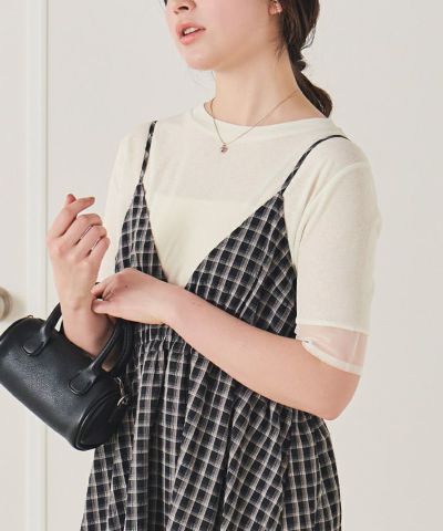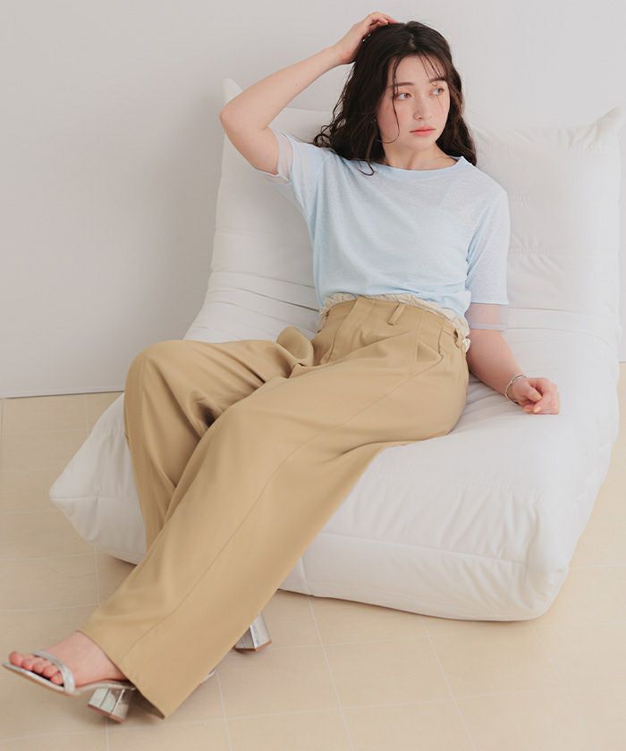 ・本体素材もほんのり透け感のあるカットソー素材で、抜け感を演出。甘さがありつつもデイリーに着やすい快適な着心地
