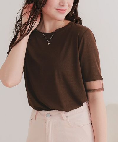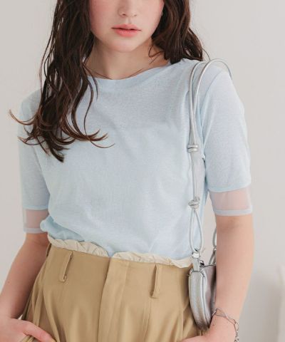 ・袖口のシアー切替がポイント。さりげない肌見せで女性らしさが高まるカットソートップス
