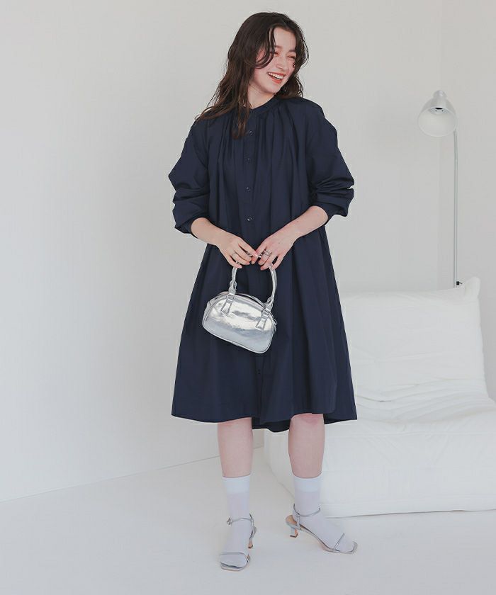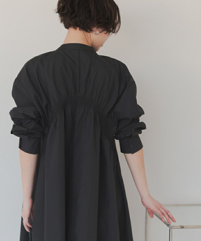 バックギャザーデザインがポイントのバンドカラーワンピース。