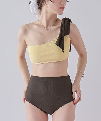 ・肩に大きなリボンを付けバランスよくワンショルダーデザインを楽しめるハイウエストビキニ。