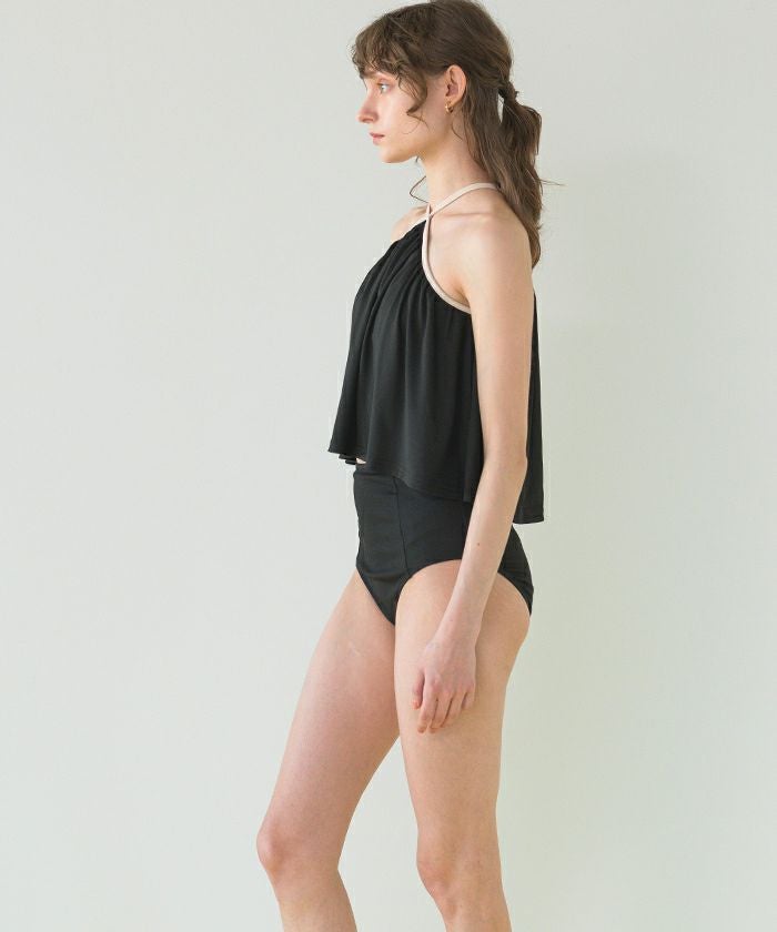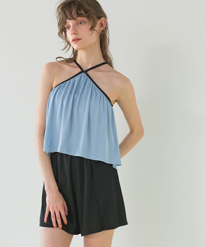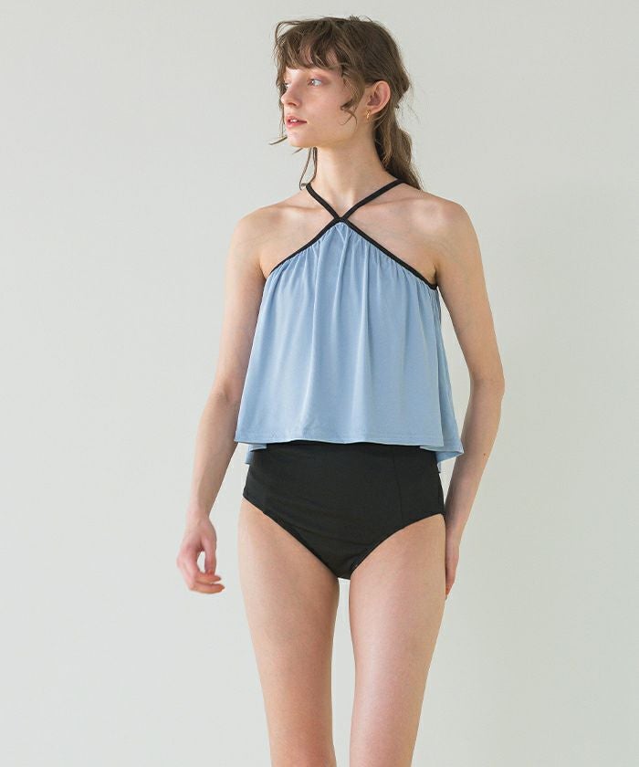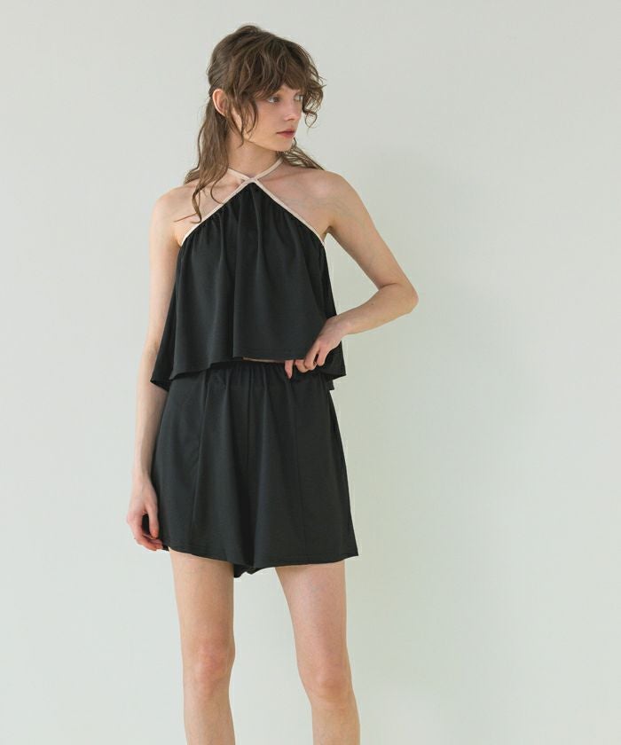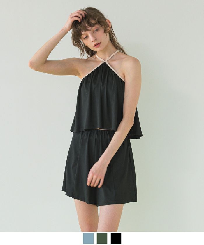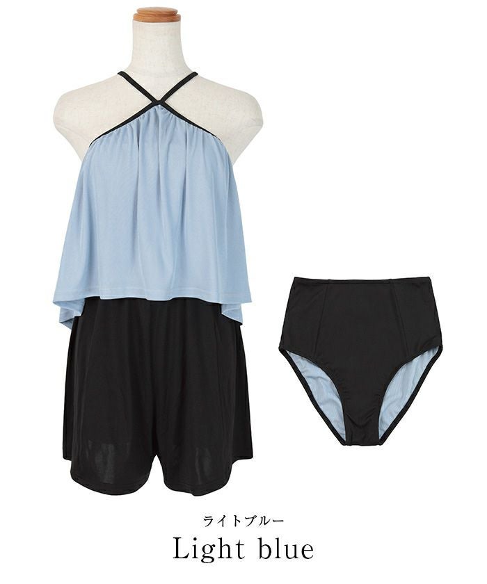 ・着こなしやすいこなれ感のあるバイカラーがポイントのショートパンツ付きフレアトップスビキニ。