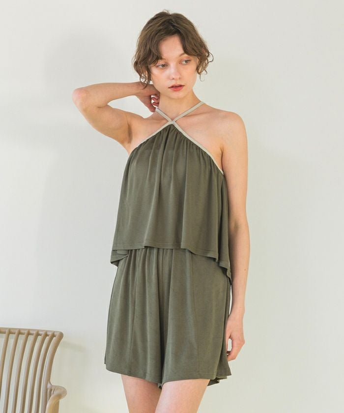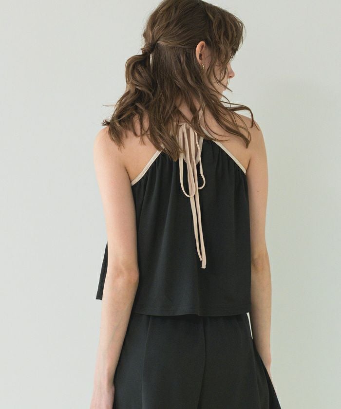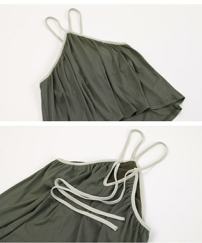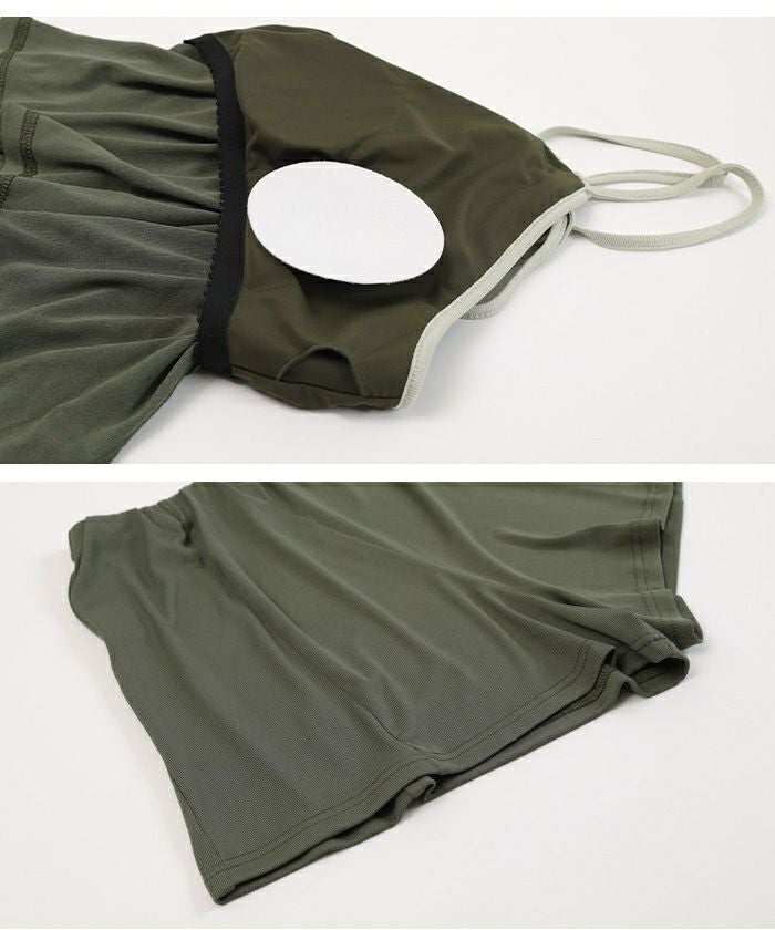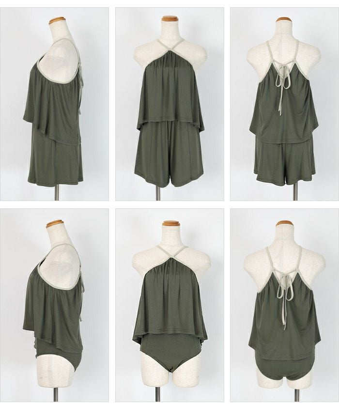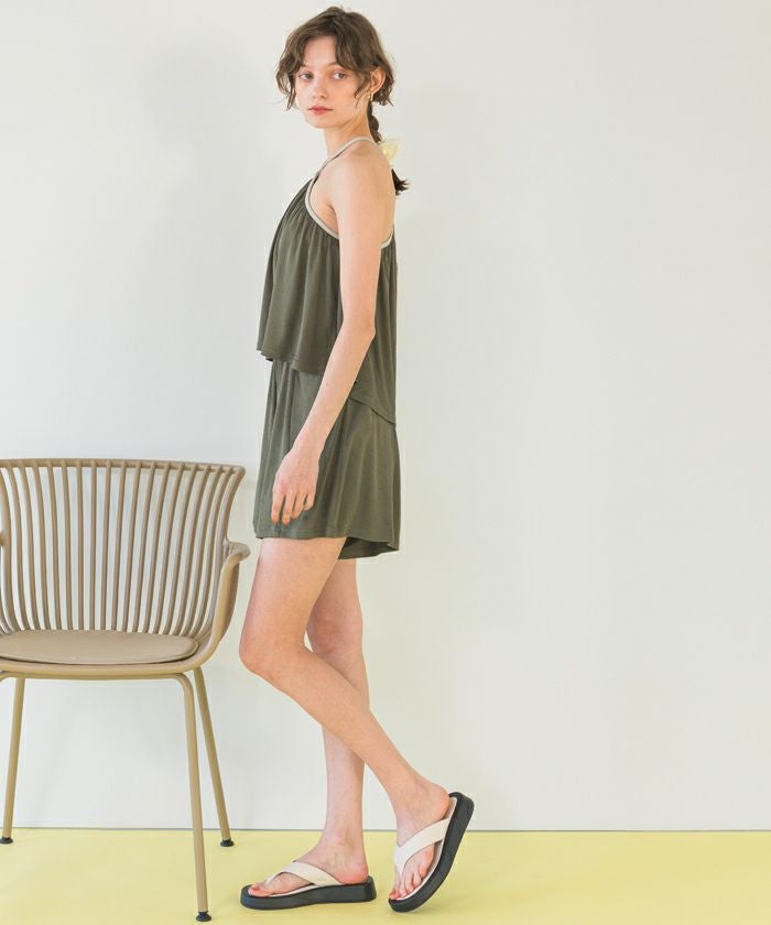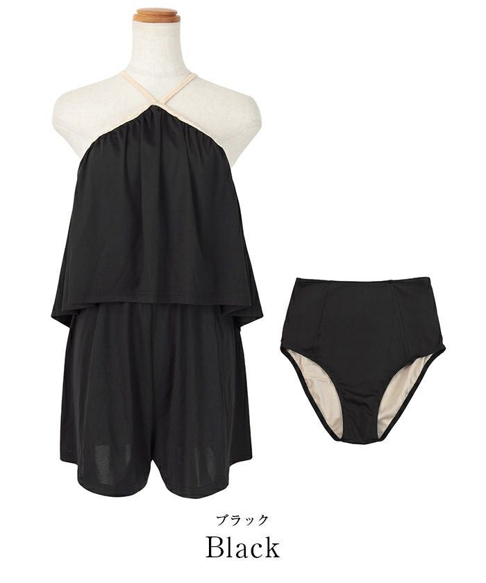 ・着こなしやすいこなれ感のあるバイカラーがポイントのショートパンツ付きフレアトップスビキニ。