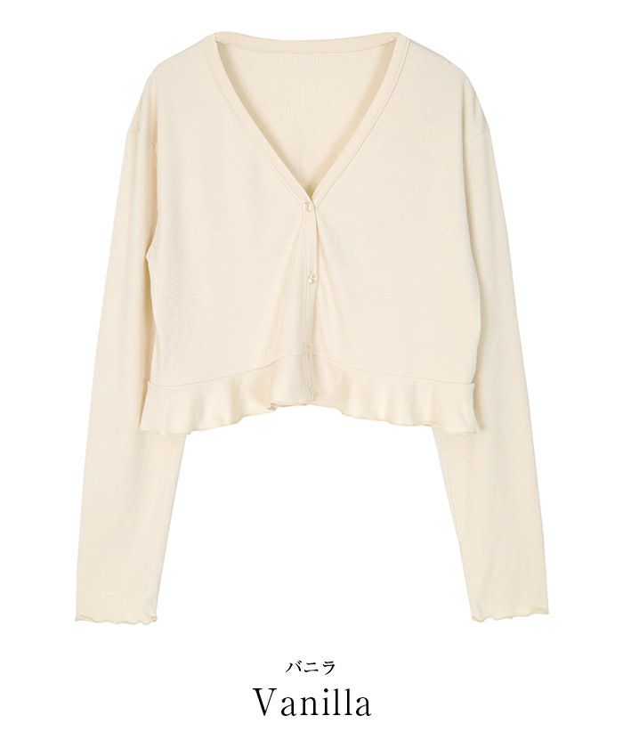 ・袖口と裾のフリルが大人可愛いショート丈カーディガン。