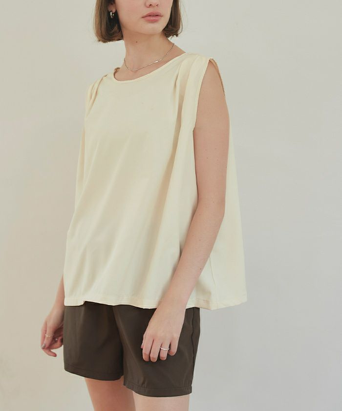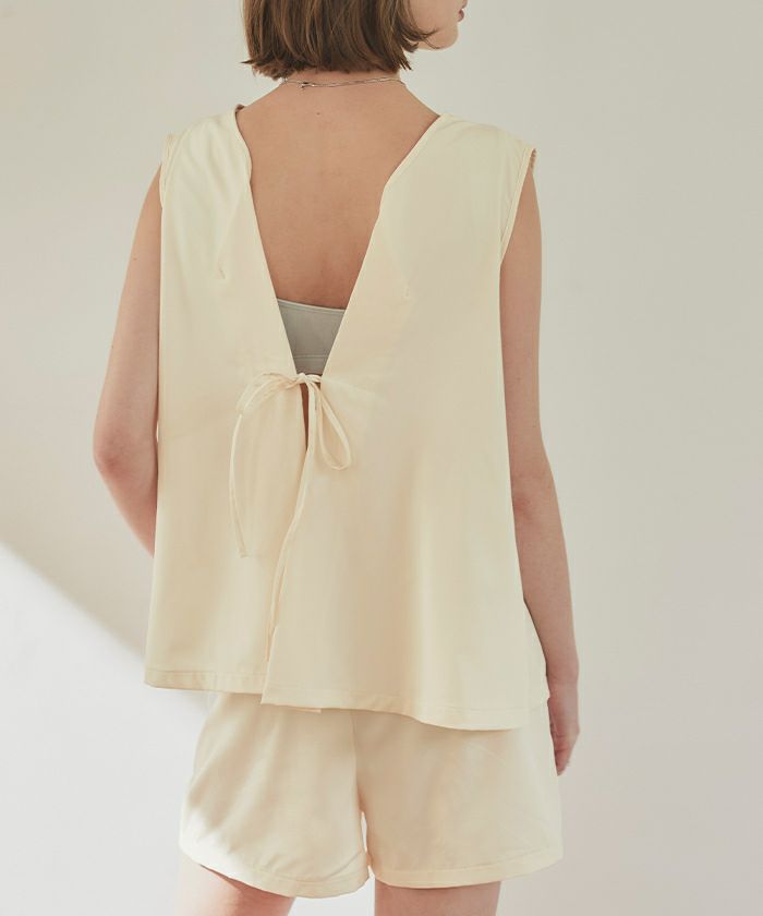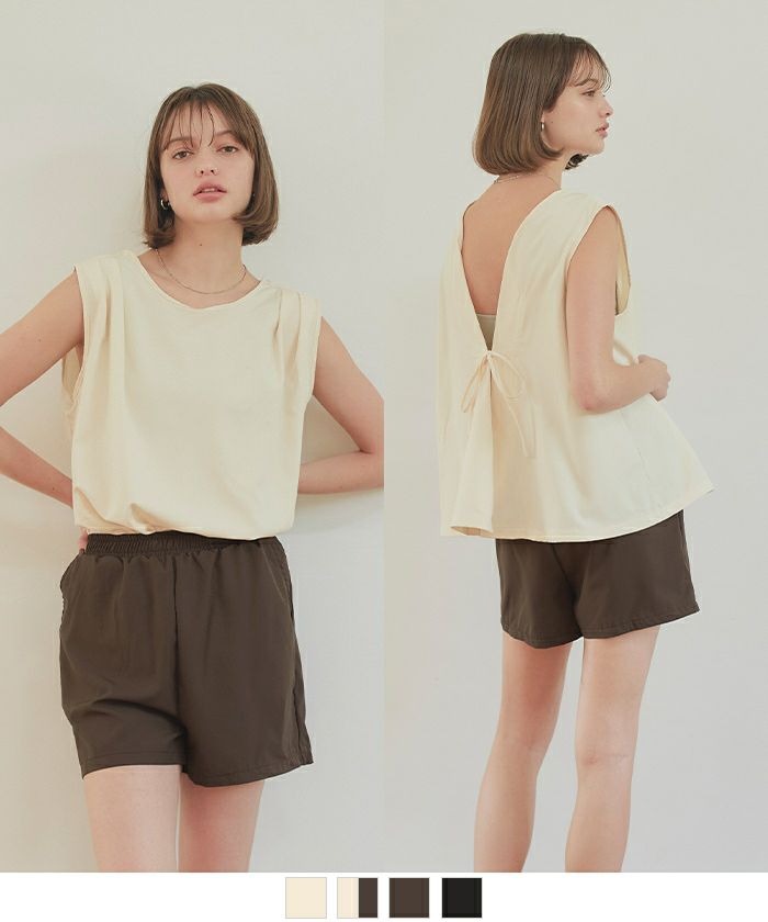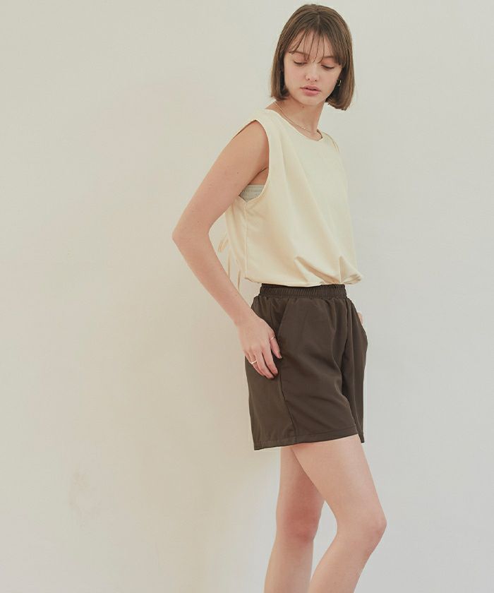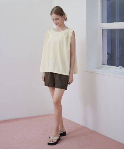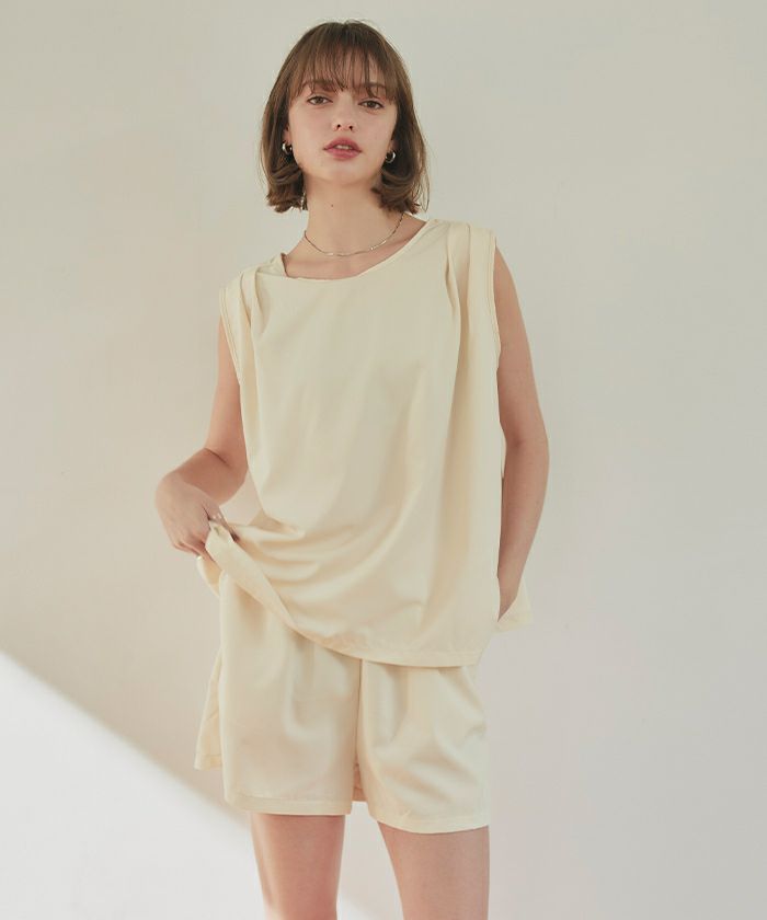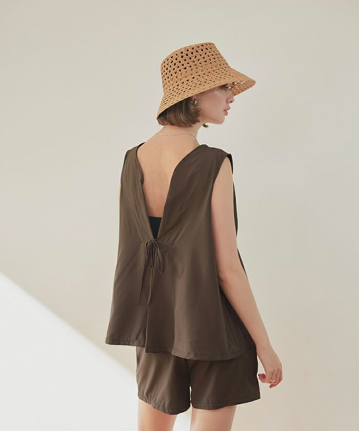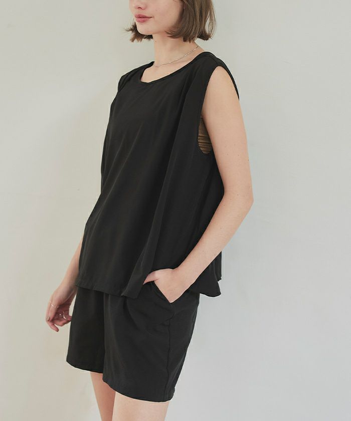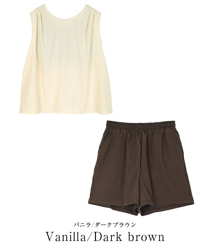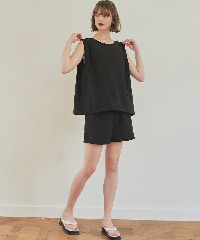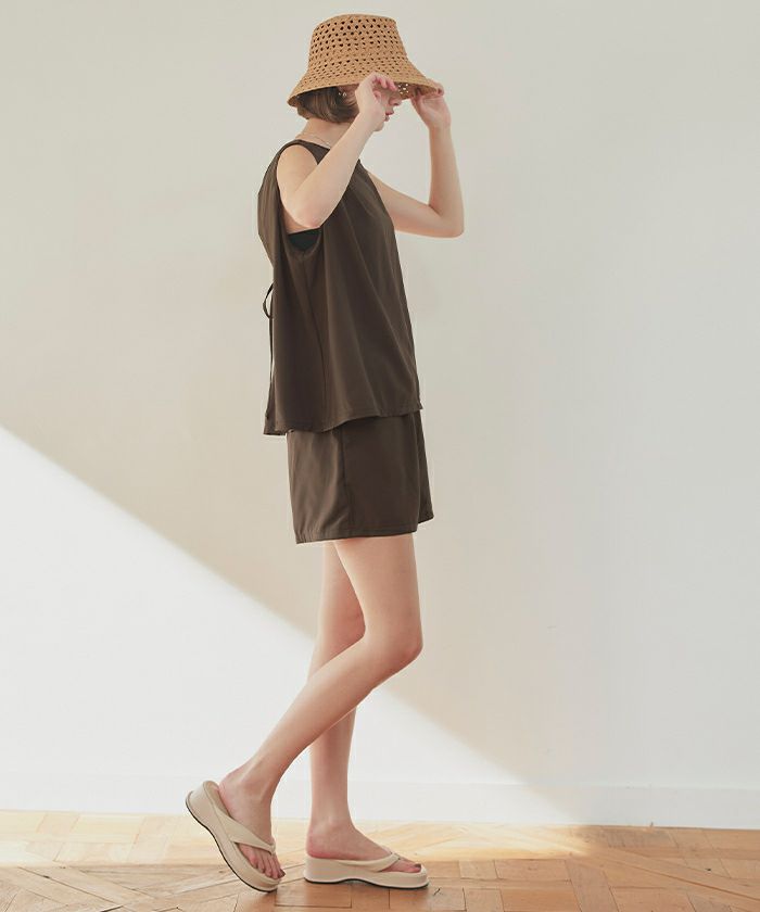 おしゃれにカバーアップが叶うビキニドッキングフレアタンクトップ×ショートパンツセットアップ。