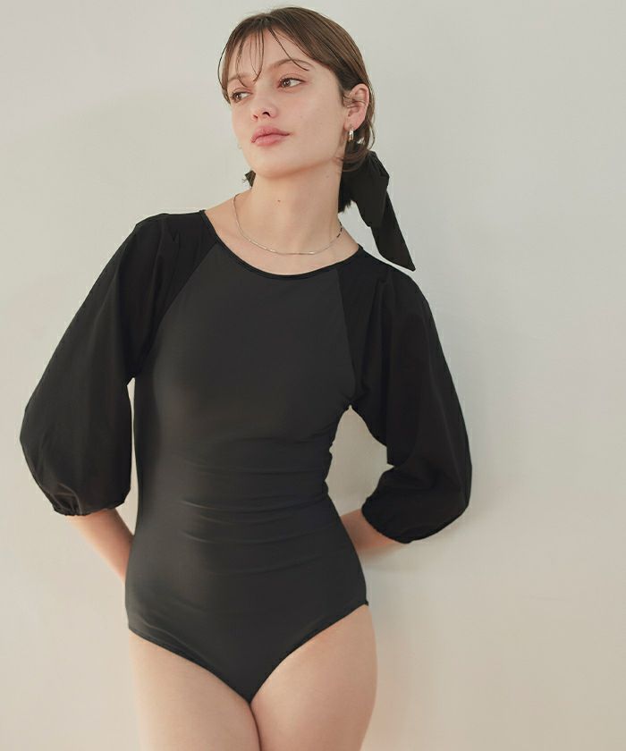本体は伸縮性の良い素材を使用しフィット感のある着心地で、パフスリーブとリボンにはハリ感のある素材を使用し、大人可愛いシルエットを叶えます。