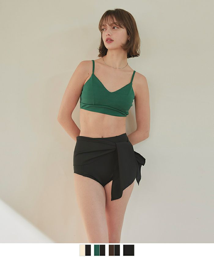 リボン付きショーツにはハリ感のあるしっかりとした高級感のある水着素材を使用。