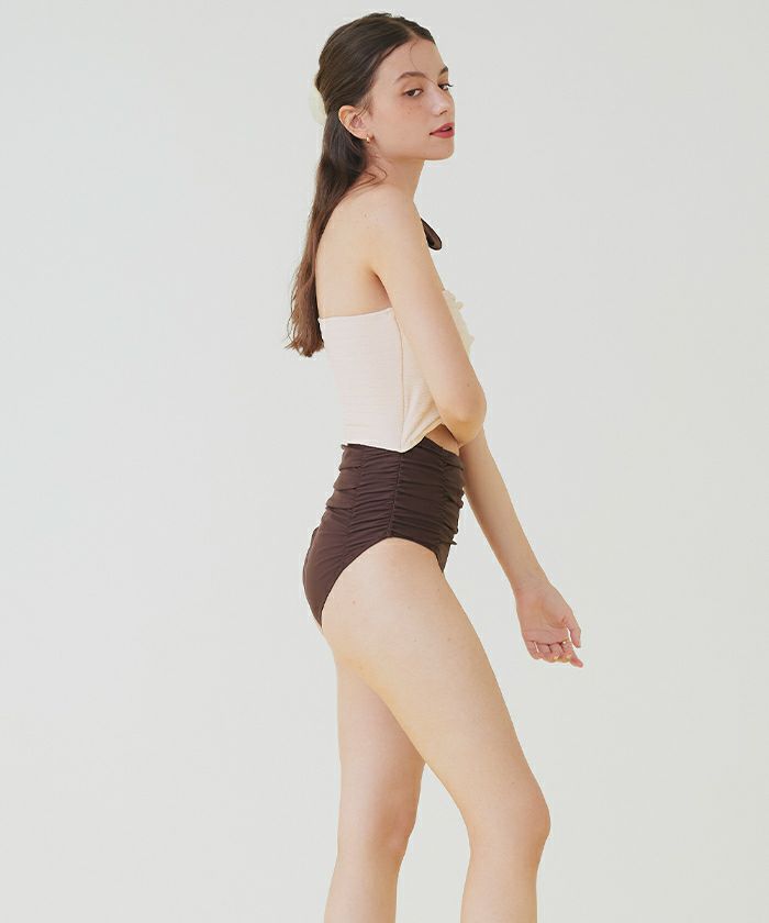 ギャザーハイウエストデザインでウエストを細く見せ、気になるお腹周りを自然にカバーしてくれる嬉しいポイント。